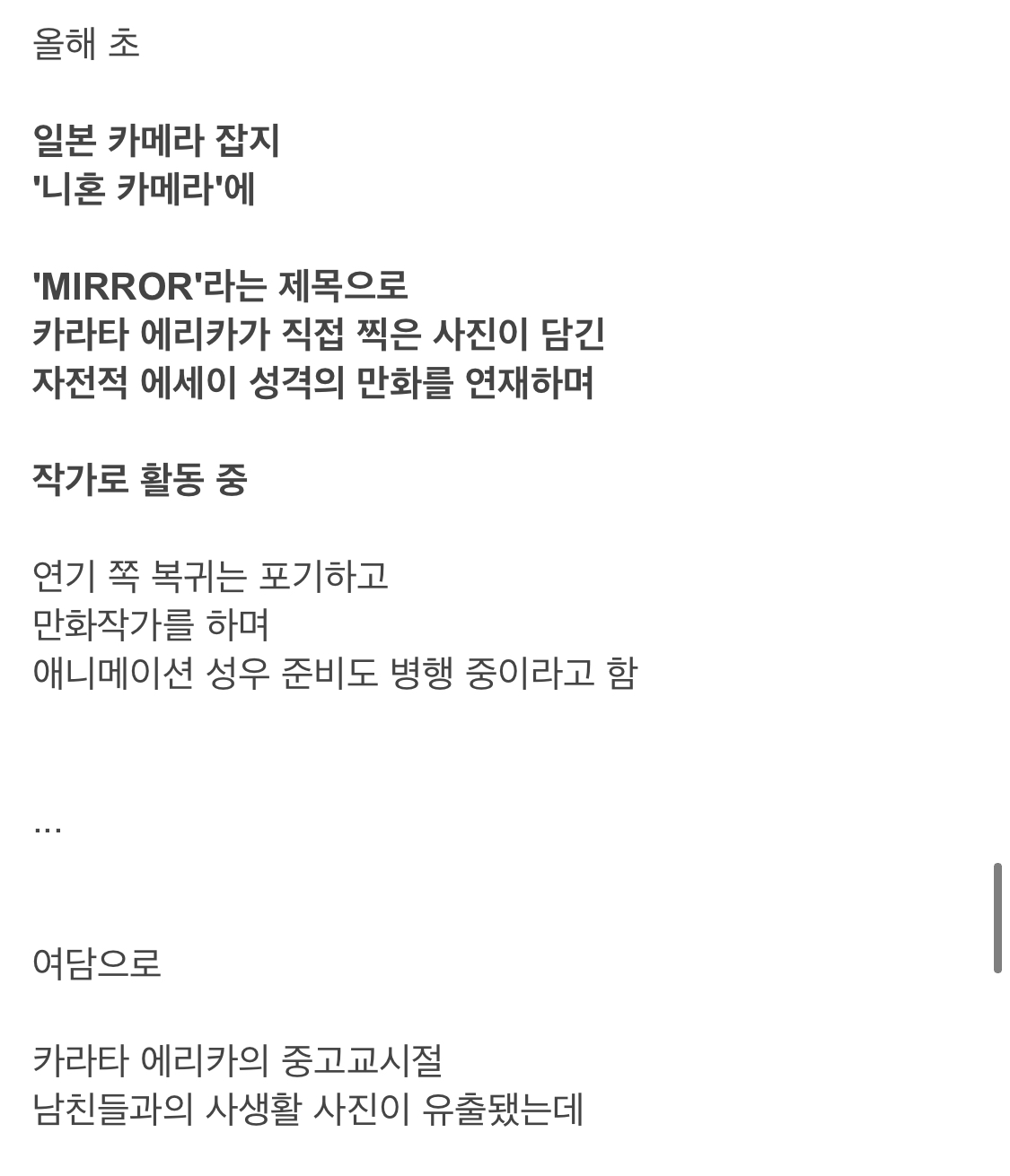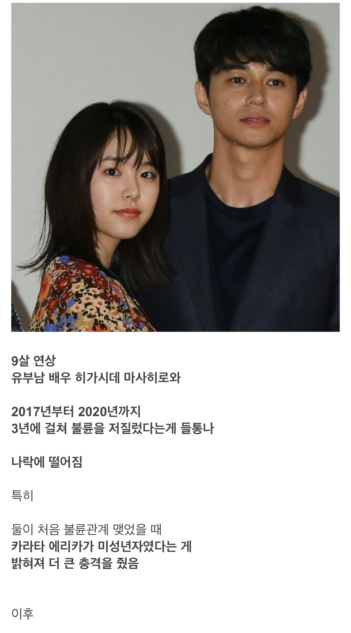 [ºÎ¿¬¼³¸í] ¸¹Àº »ç¶÷µéÀÌ Ä«¶óŸ ¿¡¸®Ä«°¡ ¹Ì¼º³âÀÚÀÌ¸é¼ ºÒ·ûÀ» ÀúÁú·¶´Ù°Å³ª ½ÉÁö¾î ¿øÁ¶±³Á¦¸¦ Çß´Ù¶ó°í ¾Ë°í ÀÖ´Â »ç¶÷ÀÌ ¸¹Àºµ¥ ºÒ·û»ç°ÇÀÌ ¹ß»ýÇÑ 2017³â ±âÁØÀ¸·Î Çѱ¹³ªÀÌ·Î 21¼¼ ½ÇÁ¦³ªÀÌ 20¼¼·Î ¼ºÀÎÀ̾úÀ½. (Ä«¶óŸ ¿¡¸®Ä«´Â 1997³â»ýÀÓ). ÇÏÁö¸¸ ´ç½Ã ÀϺ» ±âÁØÀ¸·Î´Â ¸¸ 20¼¼°¡ ³Ñ¾î¾ß ¼ºÀÎÀ¸·Î ÀÎÁ¤Çß°í (ÀÌ°Ç ¹®Á¦°¡ ¸¹´Ù´Â ÁöÀûÀÌ ¸¹¾Æ¼ ÀÌÈÄ¿¡ ÀϺ»µµ ¼ºÀÎ ±âÁØÀ» ´ëÇÐ ÀÔÇÐ ±âÁØÀÎ ¸¸ 18¼¼·Î ¹Ù²ñ) ¾Æ¹«·¡µµ ¼ºÀΰ£ ºÒ·û±â»çº¸´Ù´Â ¼ºÀΰú ¹Ì¼º³âÀÚÀÇ ºÒ·û±â»ç°¡ ÀÓÆÑÆ®°¡ Å©´Ù º¸´Ï '¹Ì¼º³âÀÚ' ¶ó´Â »ç½ÇÀÌ Å©°Ô ±â»çȵÊ. ¶ÇÇÑ ³ÃÁ¤ÇÏ°Ô µûÁ®º¸¸é Ä«¶óŸ ¿¡¸®Ä«¿Í ºÒ·ûÀ» ÀúÁö¸¥ È÷°¡½Ãµ¥ ¸¶»çÈ÷·Îµµ ½É°¢ÇÑ ¾²·¹±â¶ó°í º¼ ¼ö Àִµ¥, ºÎÀÎ '¾È'ÀÌ ÀÖÀ½¿¡µµ ºÒ±¸Çϰí È¥´Ù Ã÷¹Ù»ç, ¸¶Å° ¿äÄÚ µî ÇÔ²² ÀÛǰ¿¡ Ã⿬ÇÑ ¹è¿ìµé°ú ¸¸³ª°í ´Ù´Ï°í ¿©ÀÚ ¹®Á¦·Î ºÎÀο¡°Ô °É¸®´Â °æ¿ì°¡ ¿©·¯¹ø ÀÖ¾ú´Ù°í ÇÔ. ½ÉÁö¾î È÷°¡½Ãµ¥ ¸¶»çÈ÷·Î°¡ Ä«¶óŸ ¿¡¸®Ä«¿Í ºÒ·ûÀ» ÀúÁö¸£´ø ½Ã±â´Â ºÎÀÎÀÌ ¼Â° ¾ÆÀ̸¦ ÀÓ½ÅÁßÀÌ´ø ½Ã±â¿´À½. ¹«¾ùº¸´Ù µÑÀÇ °áÈ¥ÀÌ 5³âÀε¥ ±×Áß 3³âÀ» ºÒ·ûÀ» ÀúÁö¸£°í ÀÖ¾ú´Ù´Â ¾ê±âÀÓ.