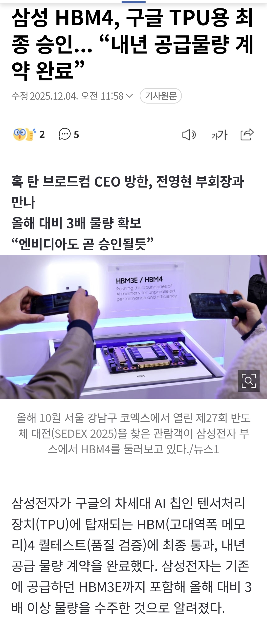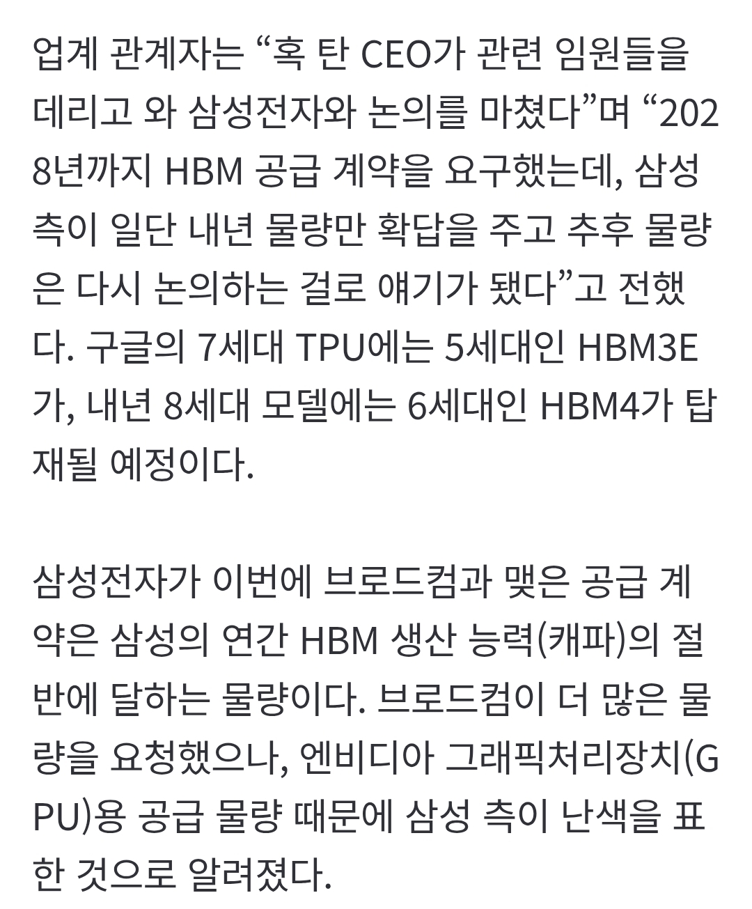 Á¦¸ñ »ï¼º HBM4, ±¸±Û TPU¿ë ÃÖÁ¾ ½ÂÀÎ... ¡°³»³â °ø±Þ¹°·® °è¾à ¿Ï·á¡± [1]
