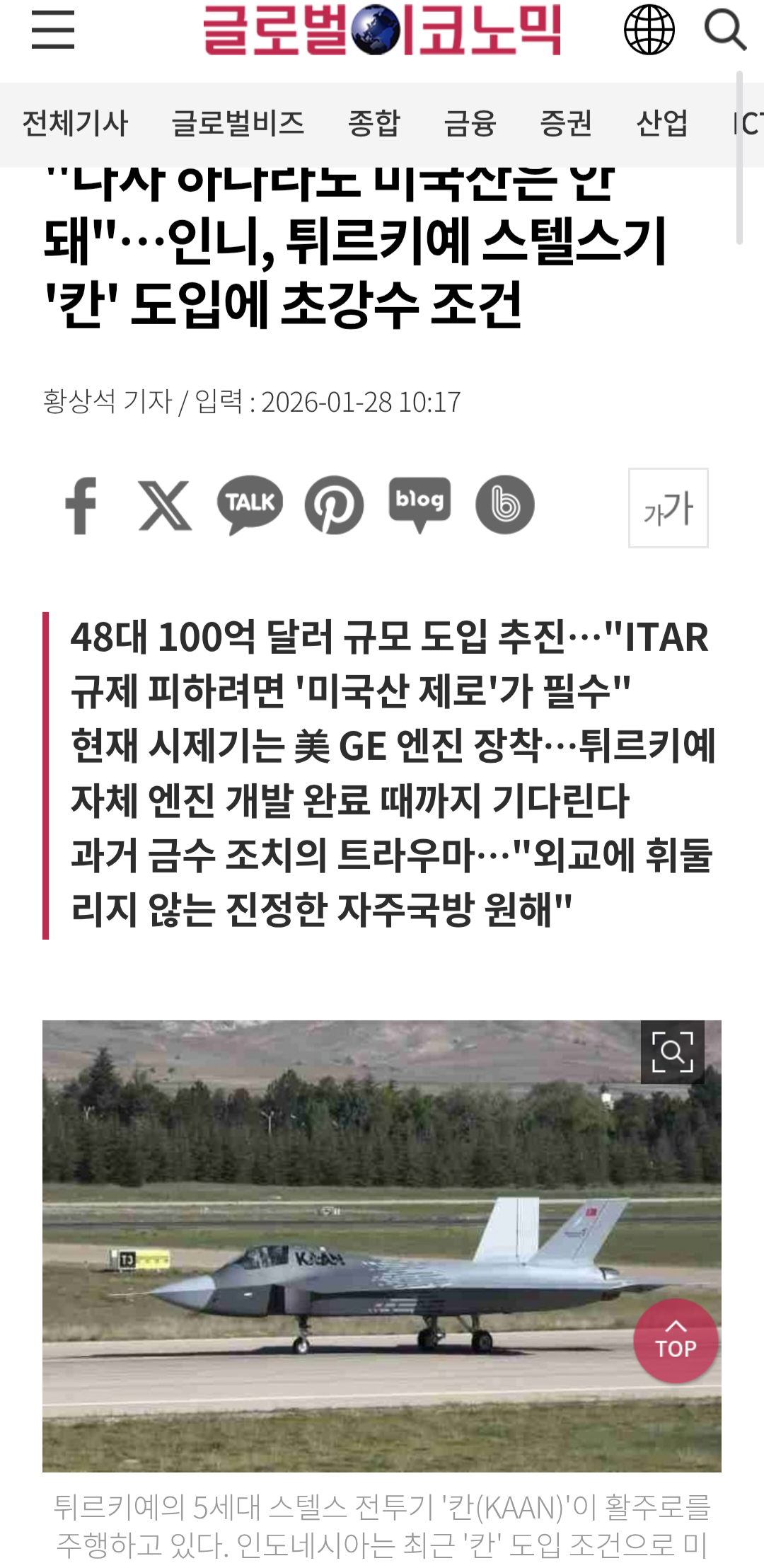 Àεµ³×½Ã¾Æ°¡ Æ¢¸£Å°¿¹ÀÇ 5¼¼´ë ½ºÅÚ½º ÀüÅõ±â 'Ä­£¨KAAN£©' µµÀÔÀ» ÃßÁøÇϸ鼭, ±âü ³»¿¡ '¹Ì±¹»ê ºÎǰ ¿ÏÀü ¹èÁ¦'¶ó´Â ±î´Ù·Î¿î ÀüÁ¦ Á¶°ÇÀ» ³»°É¾ú´Ù. ÃÑ 48´ë, 100¾ï ´Þ·¯£¨¾à 14Á¶ ¿ø£©¿¡ ´ÞÇÏ´Â ´ëÇü °è¾àÀÌÁö¸¸, ¹Ì±¹ÀÇ °£¼·À» ¿øÃµ Â÷´ÜÇØ ±¹¹æ ÁÖ±ÇÀ» ÁöŰ°Ú´Ù´Â Àεµ³×½Ã¾ÆÀÇ °­·ÂÇÑ ÀÇÁö°¡ ¹Ý¿µµÈ °ÍÀ¸·Î Ç®À̵ȴÙ.