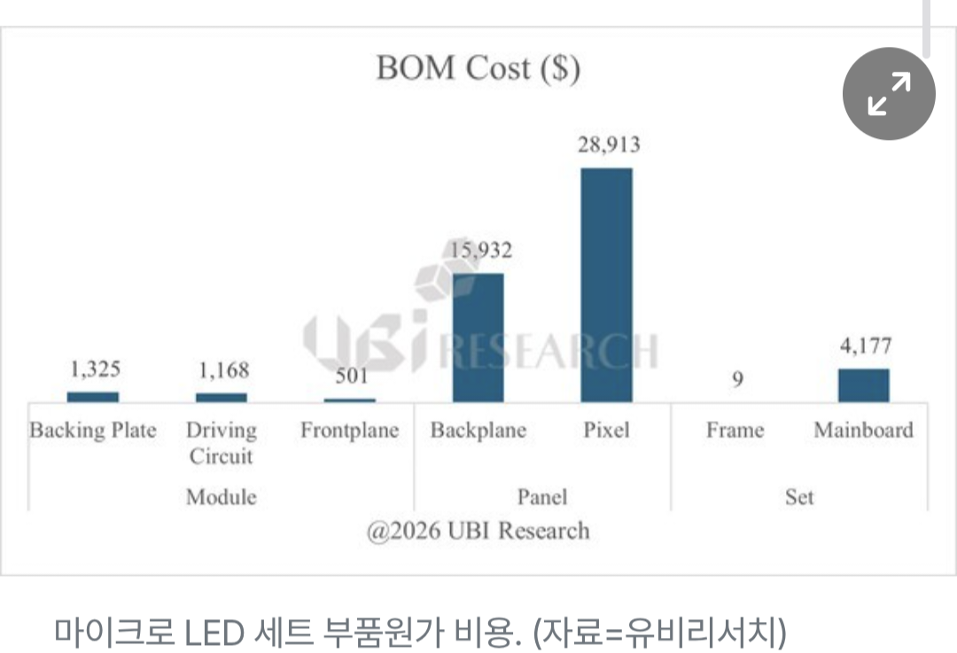 À¯ºñ¸®¼­Ä¡´Â 23ÀÏ ÀÌ °°Àº ³»¿ëÀÌ ´ã±ä 'TV¿ë 101ÀÎÄ¡ ¸¶ÀÌÅ©·Î LED ¼¼Æ® BOM ºÐ¼® º¸°í¼­'¸¦ ¹ß°£Çß´Ù. º¸°í¼­¿¡´Â ´ë·® Àü»ç¿Í ŸÀϸµ °øÁ¤À» ¹Ý¿µÇÑ »ý»ê ¼öÀ² ½Ã¹Ä·¹À̼ǰú 46Á¾ °øÁ¤ Àç·áºñ¸¦ Æ÷ÇÔÇÑ ¿ø°¡ ±¸Á¶°¡ ´ã°å´Ù.