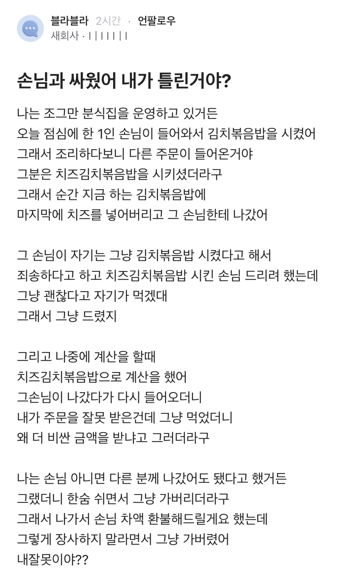 ¼Õ´ÔÀÌ ½Ç¼ö¸¦ ÇÑ °Ô ¾Æ´Ï¶ó º»ÀÎ(°¡°ÔÁÖÀÎ)ÀÇ ½Ç¼ö·Î ¼Õ´ÔÀÌ À߸ø ¸ÔÀº °Çµ¥ ±×°Å¿¡ ´ëÇÑ '¹Ý¼ºÀÇ ÀÚ¼¼'°¡ ¾ÈµÆÀݾÆ