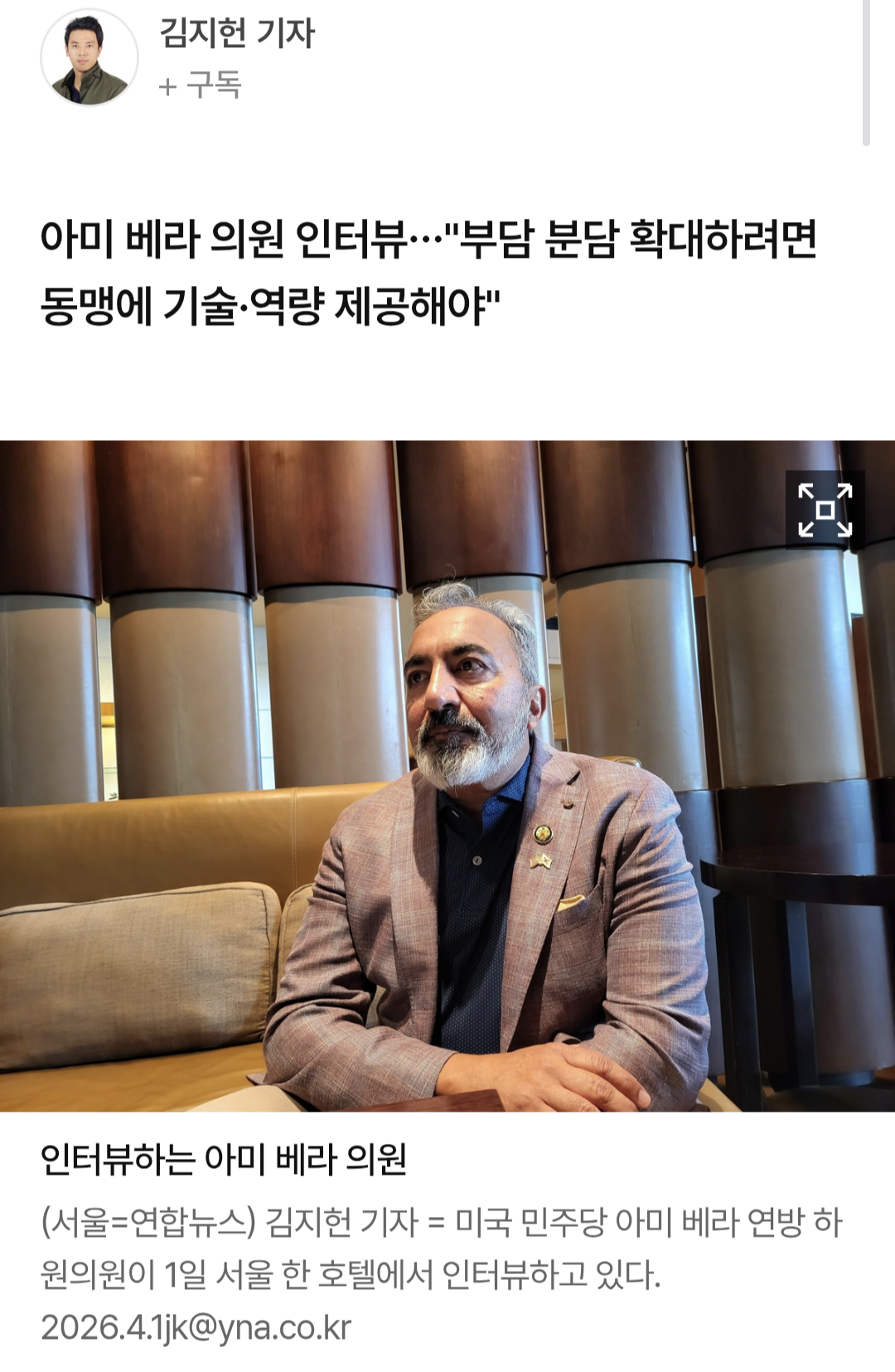 £¨¼­¿ï=¿¬ÇÕ´º½º£© ±èÁöÇå ±âÀÚ = ¹Ì±¹ ¹ÎÁÖ´ç ¾Æ¹Ì º£¶ó ¿¬¹æ ÇÏ¿øÀÇ¿øÀÌ 1ÀÏ ¼­¿ï ÇÑ È£ÅÚ¿¡¼­ ÀÎÅͺäÇϰí ÀÖ´Ù. 2026.4.1jk@yna.co.kr