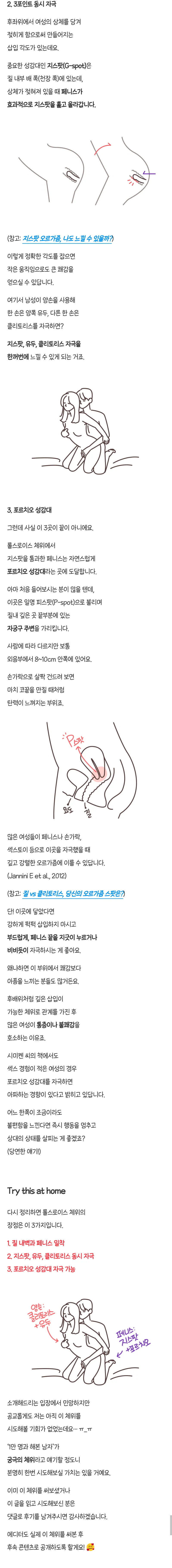 P½ºÆÌÀº ÀϺ»¿¡¼¸¸ ÁÖ·Î ¾²´Â ´Ü¾îÀÓ. Áú³» Àڱúθ¦ ÀÇÇÐÀûÀ¸·Î portio vaginalis cervicis¶ó°í Çϴµ¥ ¿©±â¼ Æ÷¸£Ä¡¿À¶ó´Â ´Ü¾îÀÇ ¾Õ±ÛÀÚ¸¸ µû¼ ¾²´Â °ÅÀÓ. ´õ º¸ÆíÀûÀ¸·Î ¾²´Â ¿ë¾î´Â A-spotÀÓ. ÁúÀüº®anterior vaginal wallÀÇ ¾Õ±ÛÀÚ A¸¦ µý ¿ë¾î. ÀڱðæºÎ°¡ ¾Æ´Ï¶ó ±× À§ÂÊ(¾ÕÂÊ) °ø°£À» ÀǹÌÇÔ. ÀڱðæºÎ´Â ÀÚ±ØÇϸé ÅëÁõÀ» ´À³¢´Â °÷ÀÌ¶ó ¾ÆÇ °Å ÁÁ¾ÆÇϴ ƯÀÌÃëÇâ ¿Ü¿¡´Â ¼±È£µÇÁö ¾ÊÀ½. ÀڱðæºÎ¿Í Ä¡°ñ »çÀÌ¿¡ °ø°£ÀÌ Àִµ¥ ¼º±â°¡ ±×ÂʱîÁö ¹Ð°í ¿Ã¶ó°¡¸é¼ ÀÚ±ØÇÏ¸é ±¸Á¶ÀûÀ¸·Î C½ºÆÌ,G½ºÆÌ,A½ºÆÌÀÌ µ¿½Ã¿¡ ÀÚ±ØµÇ°í ¿©±â¿¡ ²Ë Âù Ãæ¸¸°¨ÀÌ ´õÇØÁö¸é¼ µ¶Æ¯ÇÑ ¿À¸£°¡ÁòÀ» ´À³¥ ¼ö ÀÖ´Ù°í ÇÔ. µû¶ó¼ ÀڱðæºÎ ´À²¸Áø´Ù°í ²¨Åä¹Ì »ý°¢Çϸç ÀÚ±ØÇÏ¸é ½Î´ë±â ¸Â°Å³ª ÃÖ¾ÇÀÇ °æ¿ì ºÎ»ó±îÁö ÀÔÈú ¼ö ÀÖÀ¸¹Ç·Î Á¶½ÉÇϽðí, ÃæºÐÈ÷ ±æ´Ù¸é A½ºÆÌÀ» ³ë·Áº¼ ¼ö´Â ÀÖÀ½. ¿©¼ºÀÇ ¸ö¸¶´Ù õÂ÷¸¸º°À̶ó ÀÌ ÀÚ±ØÀ» ÁÁ¾ÆÇÏ´Â »ç¶÷µµ, ½È¾îÇÏ´Â »ç¶÷µµ Àִµ¥ ÀÏ´Ü ¿©±æ ÀÚ±ØÇÏ·Á¸é ²¿Ãò°¡ ÀϹÝÀÎ ¹üÁÖ´Â ³Ñ¾î¼´Â ½ºÆåÀÌ µÇ¾î¾ß Çϱ⠶§¹®¿¡ A½ºÆÌ Àڱؿ¡ ÀÏ´Ü ´«À» ¶ß¸é Å« ²¿Ãò¸¸ ã´Â´Ù´Â ¼Ó¼³ÀÌ ÀÖÀ½.