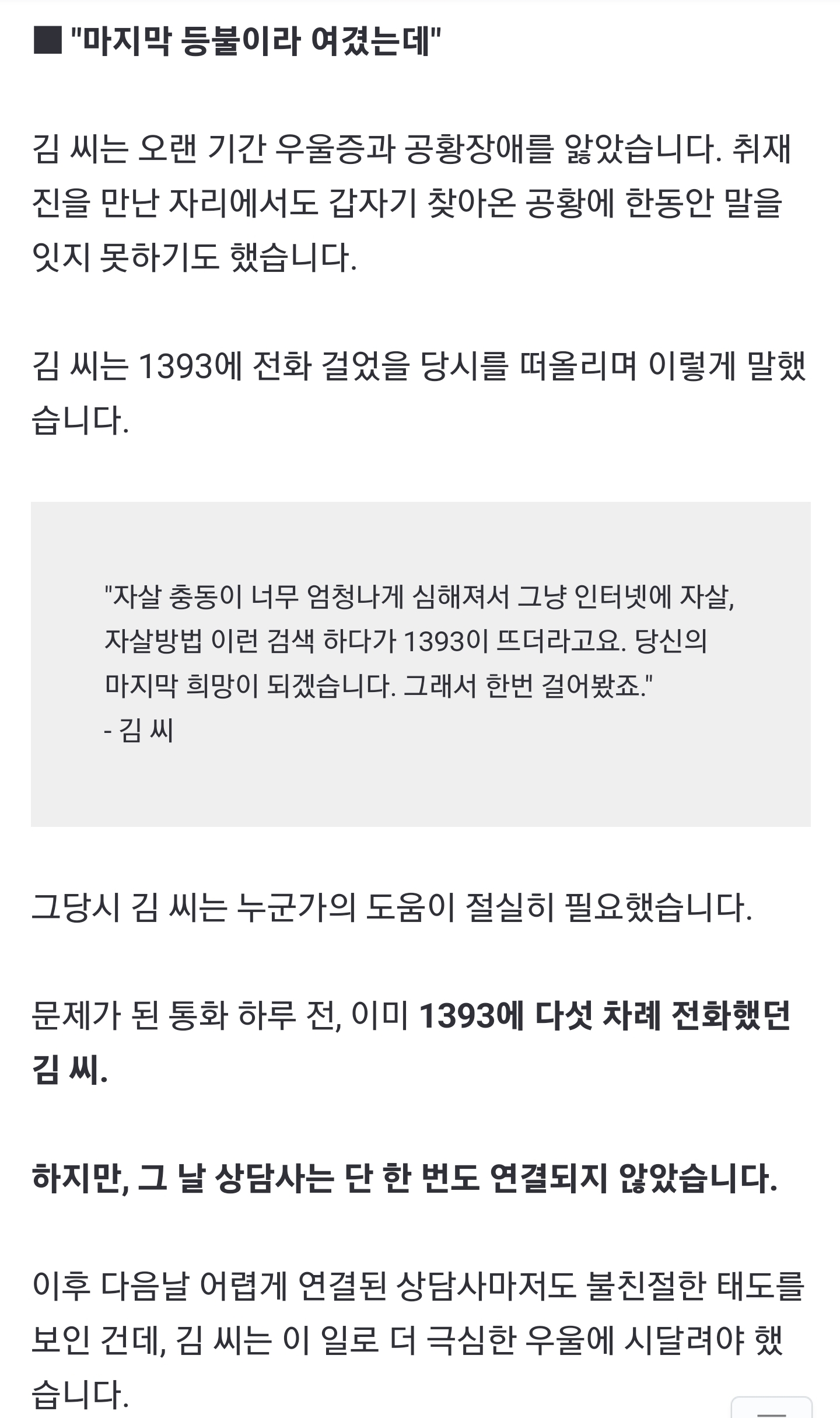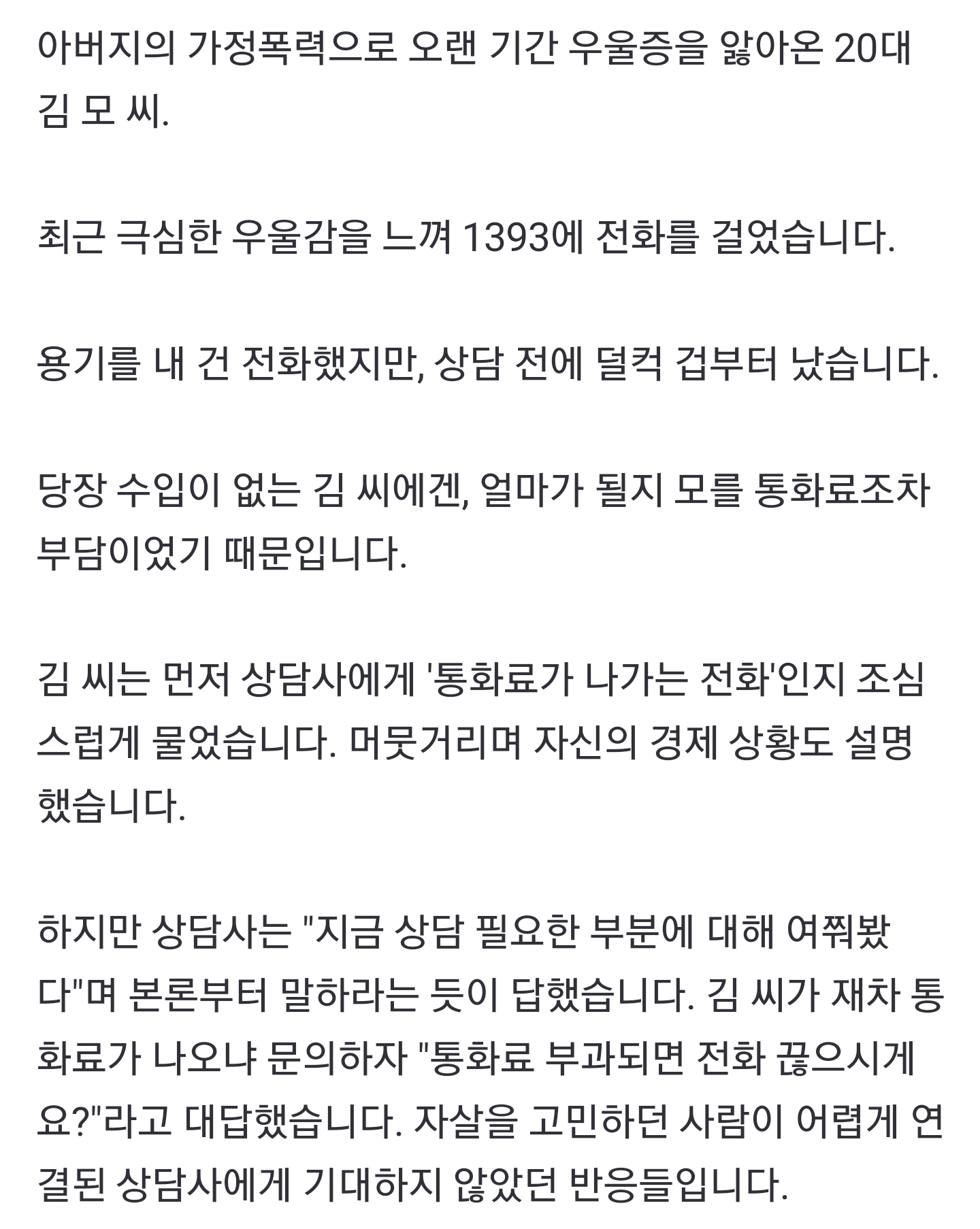 ¶È°°Àݾƿä. ±¹°¡¿¡¼ ÀÚ»ìÀ§ÇèÀÚ¸¦ À§ÇÑ »ó´ã¼¾Å͸¦ ¿î¿µÇϰíÀÚ ¸¶À½À» ¸Ô¾ú´Ù¸é, ¹«¾ùº¸´Ù Áß¿äÇÑ °ÍÀº »ó´ãÀÇ ÁúÀÔ´Ï´Ù. ±Ùµ¥ ºñÁ¤±ÔÁ÷? ¾û¸ÁÀΠó¿ì·Î ¿ÀÈ÷·Á ³»´ãÀÚ¿¡°Ô »óó¸¸ ´õ ÁÖ´Â »óȲÀÌ ¹Ýº¹µÈ´Ù¸é ÀÌ°Ç µ·Àº µ·´ë·Î ¾²¸é¼ ¿ÀÈ÷·Á »çŸ¦ ¾ÇȽÃŰ´Â °ÅÁÒ. ó¿ì°¡ ¾ÈÁÁÀ¸¸é »ó´ãÀ» ±×µûÀ§·Î ÇØµµ µÇ³Ä? ¹°·Ð ¸Â´Â ¸»¾¸ÀÔ´Ï´Ù¸¸, ±×·¸´Ù¸é ó¿ì¸¦ ÃÖ»ó±ÞÀ¸·Î ÇÏ°í ¿¬¼â»ìÀιüÀ» »ó´ã»ç·Î ¾ÉÇôµµ µÈ´Ù´Â ¸»Àΰ¡¿ä? Á¦°¡ ¹«½¼ ¸» ÇÏ´ÂÁö ÀÌÇØ°¡ Á» µÇ½Ê´Ï±î¿äµé? ¾ÈÇÑ´Ù¸é ¸ð¸£µÇ, ÀÚ»ì À§ÇèÀÚ¸¦ »ó´ãÇÏ´Â »ó´ã»ç¶ó¸é ¸ð¸§Áö±â Àü¹®¼º°ú ÀÚ°Ý ÀμºÀÌ °ËÁõµÈ ÀοøÀ» Á¤±ÔÁ÷À¸·Î »Ì¾Æ¼ ÃæºÐÇÑ ´ë¿ì¸¦ ÇØÁà¾ß ÇÏ´Â°Ô ±âº»ÀÔ´Ï´Ù. ±âº»ÀûÀ¸·Î »ó´ãÀÚÀÇ ¸àÅ»À» ì°ÜÁà¾ß ¾çÁúÀÇ »ó´ãÀÌ °¡´ÉÇÏ´Ù°í¿ä. ÀÌ ÄÉÀ̽º¿¡¼ »ó´ãÀÚ°¡ »ó´ãÀ» °³ÆÇÀ¸·Î ÇÑ °Ç ÀüÇô ¿ËÈ£ÇÒ »ý°¢ÀÌ ¾øÁö¸¸, ÀüüÀûÀÎ »ó´ãÀÇ Ä÷¸®Æ¼¸¦ ¶³¾î¶ß¸®°í ÀÖ´Â ÇöÀçÀÇ »óȲÀº ±×°Í°ú º°°³·Î °·ÂÇÏ°Ô ºñÆÇÇÏ°í °³¼±ÇØ¾ß ÇÑ´Ù´Â ¸»ÀÔ´Ï´Ù. ÀÌ°Ô ¿Ö ¼·Î ½Î¿ï°Å¸®°¡ µË´Ï±î?