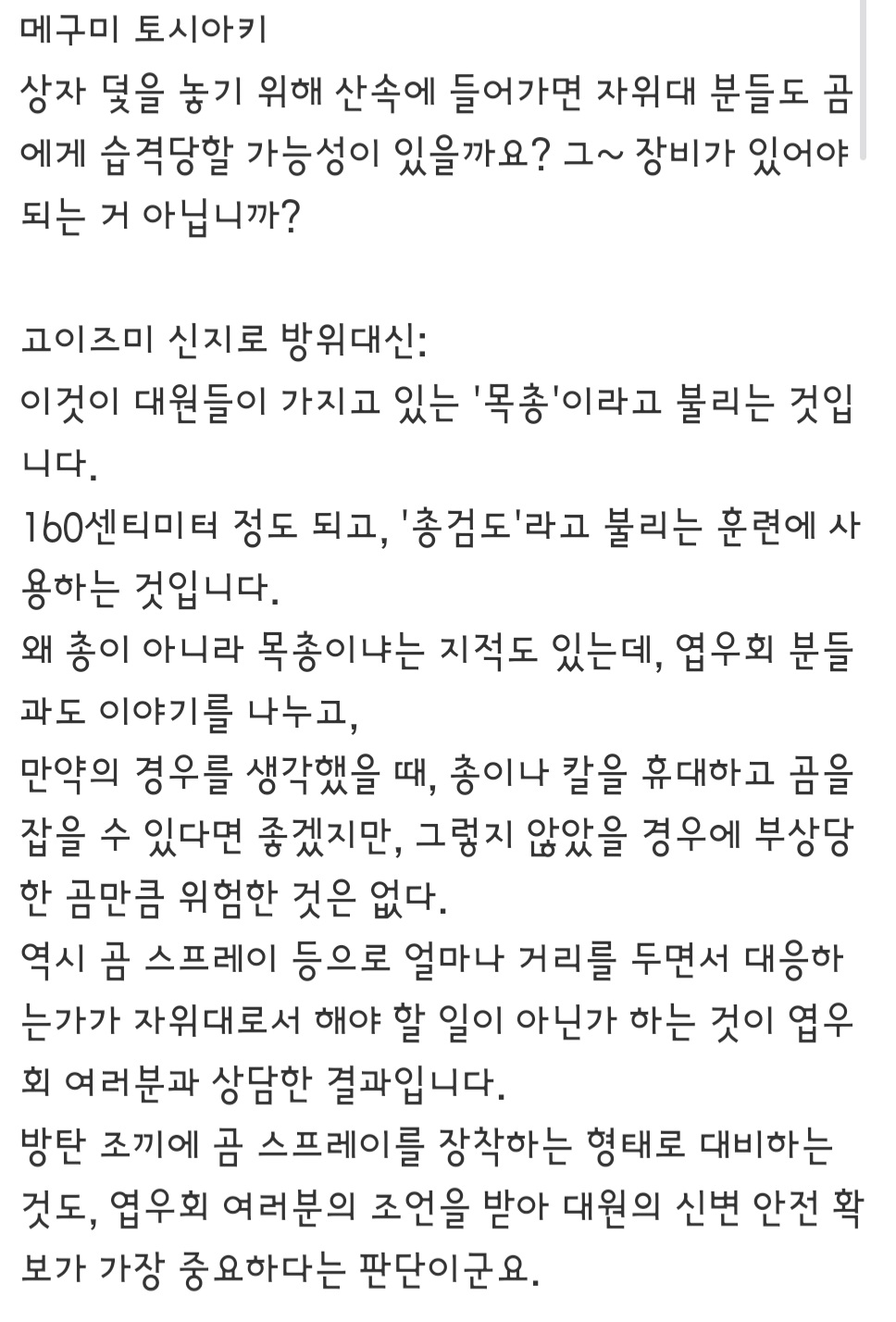 [ºÎ¿¬¼³¸í] ƯÈ÷ '°õÀÇ 2m À̳»·Î Á¢±ÙÇØ¼ ¾Æ·¡¸¦ º¸°í ÃÑÀ» ½÷¶ó' ¶ó´Â ±ÔÁ¤Àº ÀϺ» ³»¿¡¼µµ ¸¹Àº ¿åÀ» ¸Ô°í ÀÖ´Ù. »ì»ó·Â ¾àÇÑ ¿±ÃÑÀ¸·Î ½î¸é¼ °õÇÑÅ× ÀúÁ¤µµ±îÁö Á¢±ÙÇ϶ó´Â °Ç Á×À¸¶ó´Â °Å³Ä¸ç Àú ±ÔÁ¤ ¸¸µç »ç¶÷¿¡°Ô ½ÇÁ¦·Î ÇØ º¸¶ó°í ½Ã۶ó¸ç ºñ³ÀÌ ³ô´Ù. ¹«Á¶°Ç Ãѱ¸¸¦ ÇÏÇâÀ¸·Î ³õ°í ½÷¾ß ÇÏ´Â °Í ¿ª½Ã ÃѾËÀÌ °øÁßÀ¸·Î ³¯¾Æ°¬´Ù°¡ À¯ÅºÀ¸·Î ´Ù¸¥ »ç¶÷ÀÌ ´ÙÄ¥ ¼öµµ ÀÖ´Ù´Â ÀÌÀ¯¶ó°í ÇÑ´Ù. °Ô´Ù°¡ ¿±»çµé¿¡ ´ëÇÑ Àνĵµ ¾ÈÁÁ¾Æ¼ ¿±»çµéÀÌ Ã³¿ì°³¼±À» ¿ä±¸Çϸé '³Ê³× Ãë¹Ì·Î ¿±»çÀÏ ÇÏ´Â °Å ¾Æ´Ï³Ä. µ· Á¶±Ý¸¸ ¹Þ°í ÀÏÇØ¶ó.'¶ó°í ¿±»çµéÀ» ºñ³ÇÑ´Ù°í ÇÑ´Ù. ½ÉÁö¾î '°õÀÌ ºÒ½ÖÇÏ´Ï ¸¶ÃëÃÑÀ¸·Î Àâ¾Æ¶ó'¶ó´Â Àǰߵµ ½ÇÁ¦·Î ÀÖ´Ù. »ñÆ÷·Î ÁÖÅð¡¿¡ ħÀÔÇÑ °õÀ» ÀâÀº ¾î¶² ¿±»ç´Â ´©±º°¡°¡ Àüȸ¦ °É¾î "Àΰ£Àº 75¾ïÀ̳ª ÀÖÀ¸´Ï Àΰ£ÀÌ ÇÑµÑ Á¤µµ Á׾ »ó°ü¾ø´Ù. ºÒ°õÀÌ ´õ Áß¿äÇÏ´Ù." ¶ó¸ç 30ºÐ ³Ñ°Ô ºÒÆòÇÑ »ç¶÷µµ ÀÖ¾ú´Ù°í ÇÏ¸ç °õ »ç»ì ±â»ç°¡ ³ª¸é ÇØ´ç ÁöÀÚü¿¡ ¹Î¿øÆøÅº°ú Ç×ÀÇÀüȰ¡ ½ñ¾ÆÁ® ¾÷¹«¸¦ º¸Áö ¸øÇÒ Áö°æÀ̶ó°í ÇÑ´Ù.