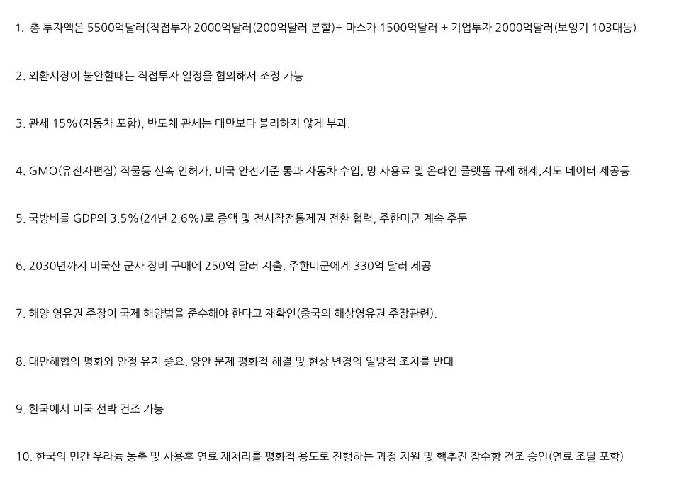 ¾Æ ¾à¼Ó ³ª°¬´Ù ¿Ô´õ´Ï ´ñ±ÛÀÌ ¸¹³×.. µýÁö °É ½Ã°£¿¡ whitehouse.gov¿¡ fact sheet µé¾î°¡¸é ¿ø¹® º¼ ¼ö ÀÖ¾úÀ» °Çµ¥ ±×·± ³ë·ÂÀÌ ¾ø´Â °Ç Á» ¾Æ½±³×.. ÀÌÇÏ ³»¿ëÀº ¿ø¹® ¹ÙÅÁÀ¸·Î ´Ù½Ã ¾ê±âÇÏ´Â °Å°í ÇÒ ¾ê±â ¸¹À¸´Ï À½½¿Ã¼ // 4¹øÀº ´Ü¼ø Áöµµµ¥ÀÌÅÍ "¹ÝÃâ"ÀÌ ¾Æ´Ï¶ó µðÁöÅÐ ¼ºñ½º Àü¹ÝÀÇ "»óÈ£" µ¥ÀÌÅÍ ÀÌÀü ÃËÁøÀÓ. À§Ä¡¡¤À纸Ç衤°³ÀÎÁ¤º¸ µîÀÇ ¾ç¹æÇâ À̵¿À» ¸»ÇÏ´Â °Å°í, ¿ì¸® ±â¾÷µéµµ ¹Ì±¹¿¡¼ µ¥ÀÌÅÍ °¡Á®¿Ã ¼ö ÀÖÀ½. // ±¹¹æºñ´Â ¿ì¸® ÀÚü ¹æÀ§·Â °È¸¦ À§ÇÑ °ÅÀÓ. GDP 3.5%´Â ¿ì¸® ±º Çö´ëÈ¿¡ ¾²´Â µ·ÀÌÁö ¹Ì±¹ ÁÖ´Â °Ô ¾Æ´Ô. ÀüÀ۱ǵµ ¿ì¸®°¡ ÁÖµµ±Ç °®´Â´Ù´Â °Çµ¥ ½ÇÀÍÀ» µûÁö´Â °Ô Áß¿äÇÑ °¡ ½ÍÀ½. ¾Èº¸ ¾Æ´Ô? // 6¹ø ¹Ì±¹ ¹«±â ±¸¸Å 250¾ï ´Þ·¯´Â ÷´Ü ¹«±â ½Ã½ºÅÛ È¹µæÀÓ. ±¹»êÈ ¸¹ÀÌ µÆ¾îµµ F-35 °°Àº 5¼¼´ë ÀüÅõ±â, ÀÌÁö½º ½Ã½ºÅÛ, ÇÙÀá¼öÇÔ ±â¼ú µîÀº ¿©ÀüÈ÷ ¹Ì±¹ ±â¼ú ÇÊ¿äÇÔ. // 330¾ï ´Þ·¯´Â ¿ø¹®¿¡ "ROK's plan to provide comprehensive support for U.S. Forces Korea amounting to $33 billion"À̶ó°í ¸í½ÃµÅ ÀÖÀ½. ¿ì¸®°¡ ÁÖÇѹ̱º¿¡ Á¦°øÇÏ´Â °Å ¸ÂÀ½. ¾Ö¸ÅÇÑ °Ô ¾Æ´Ï¶ó ¸íÈ®ÇÔ. ¾ÖÃÊ¿¡ ÁÖÇѹ̱ºÀÌ ¿ì¸± ÁÙ ÀÌÀ¯°¡ ¾øÀÝÀ½.