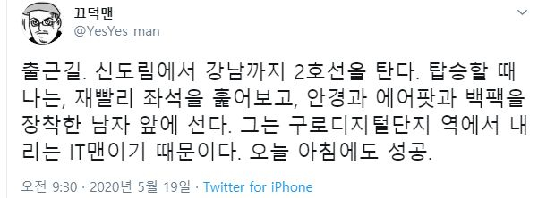 Ãâ±Ù±æ, ½Åµµ¸²¿¡¼ °³²±îÁö 2È£¼±À» ź´Ù. ¾ÉÀ» ¶§ ³ª´Â À绡¸® ¹Ì¸® ±¸ºñÇØµÐ ¾È°æ°ú ¿¡¾îÆÌ°ú ¹éÆÑÀ» º¸¶õµíÀÌ ¾ÕÀ¸·Î ²¨³» ³õ´Â´Ù. ¿ª½Ã³ª ¿À´Ãµµ ÇÑ ³²ÀÚ°¡ ³ª¸¦ ÇâÇØ ´Ù°¡¿Â´Ù. ³ª¸¦ º¸¸ç ÀÔ¸ÀÀ» ´Ù½Ã´Â ±× ³²ÀÚÀÇ ½Ã¼±ÀÌ ±¸·ÎµðÁöÅдÜÁö¿ª¿¡ ²ÈÈù´Ù. ¿ª¿¡ µµÂøÇÏÀÚ »ì¦ ¾ûµ¢À̸¦ ¶¾´Ù. ±×ÀÇ ÀÔ²¿¸®°¡ ¿Ã¶ó°¡´Â °ÍÀÌ º¸ÀδÙ. ÇÏÁö¸¸ ³ª´Â ´Ù½Ã ¾É´Â´Ù. ¸ñÀûÁö´Â °³²¿ª. ¿À´Ã ¾ÆÄ§¿¡µµ ¼º°ø. ±Ùµ¥ ÀÌ ³²ÀÚ ³ª¸¦ º¸¸ç °è¼Ó ÀÔ¸ÀÀ» ´Ù½Å´Ù. ¹¹Áö?