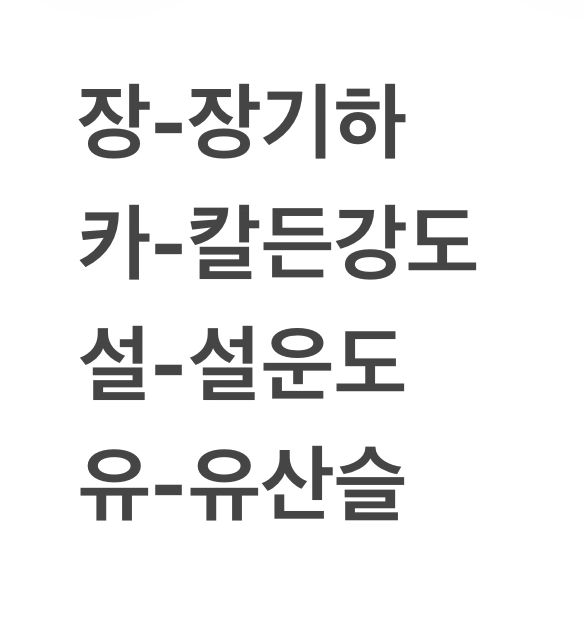 ÀåÄ«¼³À¯¶ó´Â ¸»Àº ¸ô¶úÁö¸¸ ÇѱÛÀÚ¾¿ µéÀ»¼ö·Ï ´ëÃæ ´©±¸Àΰ¡? ÇÏ´Â »ý°¢Àº µå´Âµ¥ '¼³'Àº °¨ÀÌ ¾È¿È ¤»¤» Àå-ÀåÁ¦½º Ä«-Ä«½ºÆ®·Î, ¼³-¼³ºù?? À¯-À¯¹æ