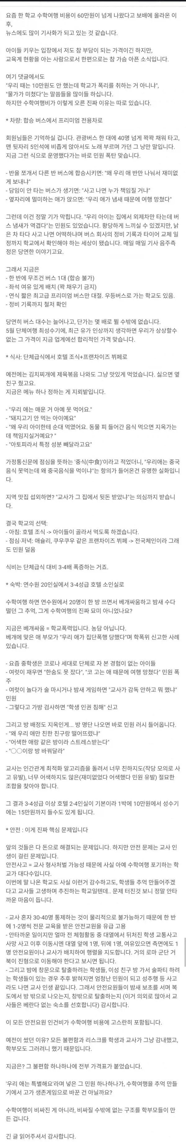 ¾Æ´Ï Àú·¸°Ô¸¸ ½á³õÀ¸¸é ¾ÈµÇÁö. Àú±â¿¡ ´©¶ôµÈ Ç׸ñÀÌ ÀΰǺñÀÓ. ¼±»ý´Ôµé ¸»°í ±³À°ºÎ ÁöħÀ¸·Î Àü¹®Àη 1Àδç 3~4¸íÀ» Ã¥ÀÓÁ®¾ß Çϰí 2±³´ë¶ó¼ 40¸íÀÌ ¼öÇп©Çà °£´Ù°í Çϸé 10¸íÀÇ Àü¹®ÀηÂÀÌ ÇÊ¿äÇÔ. Áï Àη°ú °ü·ÃµÈ ºñ¿ëµµ Æ÷ÇÔ½ÃÄѳö¾ß µÊ. ´Ü¼øÈ÷ ¾ÆÀ̵éÀÌ ÀÌ¿ëÇÏ´Â ºñ¿ë¸¸ û±¸µÈ°Ô ¾Æ´Ô