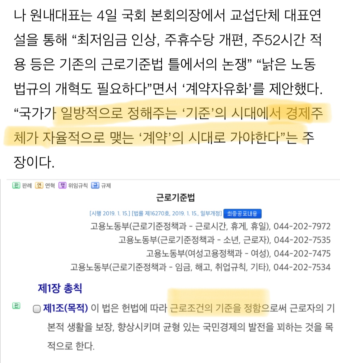 ±Ù·Î±âÁعýÀÌ ¸»ÇÏ´Â '±âÁØ'Àº ¸» ±×´ë·Î 'ÃÖ¼ÒÁ¶°Ç'ÀÌ°í ±Ù·ÎÀÚ´Â ÀÌ°É ¹Ýµå½Ã ´©·Á¾ßÇÒ ±Ç¸®°¡ ÀÖÀ¸¸ç »ç¿ëÀÚ¿¡µµ ÀÌ ¹ýÀ» Áöų Àǹ«°¡ ºÎ¿©µÊ. ½Ã´ë°¡ ºü¸£°Ô º¯Çϴµ¥ ºñÇØ¼ ±Ù·Î°ü°è ¹ý·É Á¦Á¤/°³Á¤¼Óµµ´Â µÚµû¶ó °¡Áö ¸øÇÏ°í ¿ÀÈ÷·Á ÀÌ·± ¹ý¶§¹®¿¡ ÇÇÇØ¸¦ º¸´Â ±Ù·ÎÀÚµéÀÌ »ý±â±âµµ ÇÏÁö. ¿¹¸¦µé¾î ÁÖ52½Ã°£. ÀÚ±â½Ã°£º¸´Ù µ·À» ¹Ù¦¹ú°í ½ÍÀº ±Ù·ÎÀÚµéÀÌ À־ ÀÌ ¹ý¶§¹®¿¡ »ç¿ëÀÚµµ ±Ù·ÎÀÚµµ ¸øÇÔ. ÀÌ°É ÇØ¼ÒÇϰíÀÚ °è¾àÀÚÀ¯¹ýÀ» 'Ãß°¡'ÇÏÀڴ°ÅÀÓ. ¸ñÀûÀº ÁÁÁö¸¸ ¾Ç¿ëÇϴ»ç·Ê°¡ ³ª¿Ã°Í »·Çϱ⶧¹®¿¡ ³ªµµ ¹Ý´ëÇÏ´Â ÀÔÀåÀÓ. ÀÌ°Ô ±Ù±â¹ýÆóÁö´Â ¾Æ´ÏÁö ¼±µ¿Àº¤¤¤¤