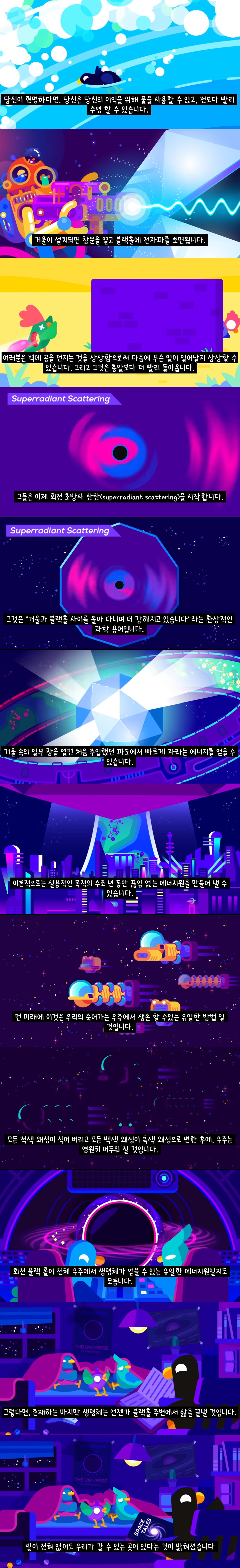 °Å¿ï¾È¿¡ ºûÀ» ½÷¼­ ¿¡³ÊÁö¸¦ Çѹø¿¡ ¾ò´Â´Ù´Â °Ç »ó´çÈ÷ Èï¹Ì·Î¿î ¾ÆÀ̵ð¾î·¡. °ø°£À» ¾ÆÁÖ¾ÆÁÖ ³Ð°Ô »ý°¢Çϰí, °Å¿ï·Î µÈ »óÀھȿ¡ ºí·¢È¦À» °¡µÐ´ÙÀ½¿¡ ÀüÀÚÆÄ¸¦ ½î¸é ÀÛ¿ë±ÇÀ» Åë°úÇÏ¸ç ¿¡³ÊÁö¸¦ ÁõÆø½ÃÄÑ ÁشٳªºÁ. ȸÀü Ãʹæ»ç »ê¶õ(superradiant scattering)À» ÀÌ¿ëÇÏ¸é ³ªÁß¿¡ ¿Â ¿ìÁÖÀÇ °ø°£ÀÌ ºûº¸´Ù ´õ ºü¸£°Ô ¸Ö¾îÁö°í ¸ðµç º°,ÀÚ¿øÀº ¸ÕÁö°¡ µÇ¹ö¸° ¼öõ¾ï³âÈÄ¿¡ Àΰ£ÀÌ ¸¶Áö¸·À¸·Î ¾òÀ»¼ö ÀÖ´Â À¯ÀÏÇÑ ¿¡³ÊÁö¿øÀΰ¡ºÁ. (ÀÌ·ÐÀûÀ¸·Î) https://youtu.be/ulCdoCfw-bY ¹Ï°Å³ª ¸»°Å³ª