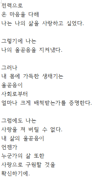 ÀÚ±âÀÚ½ÅÀ» »ç¶ûÇÔ°ú ¿Ã°ðÀ½ÀÌ ¼¼»ó¿¡¼´Â ½±°Ô ÅëÇÏÁö¾Ê´Ùº¸´Ï Çö½Ç¿¡ ¼øÀÀÇϱâµÎÇÏ´õ¶ó±¸¿ä..±×·¯´Ùº¸´Ï ½±°Ô ÀDZâ¼ÒÄ¡ÇØÁö±¸¿ä ÇÏÁö¸¸ ²à²àÈ÷ ¿À¶ÒÀÌó·³ ÀϾ Àڱ⸦ »ç¶ûÇÑ´Ù¸é »ó´ë¹æµµ »ç¶ûÀ¸·Î ÀÏÀ¸ÄÑÁÙ¼öÀÖÁÒ