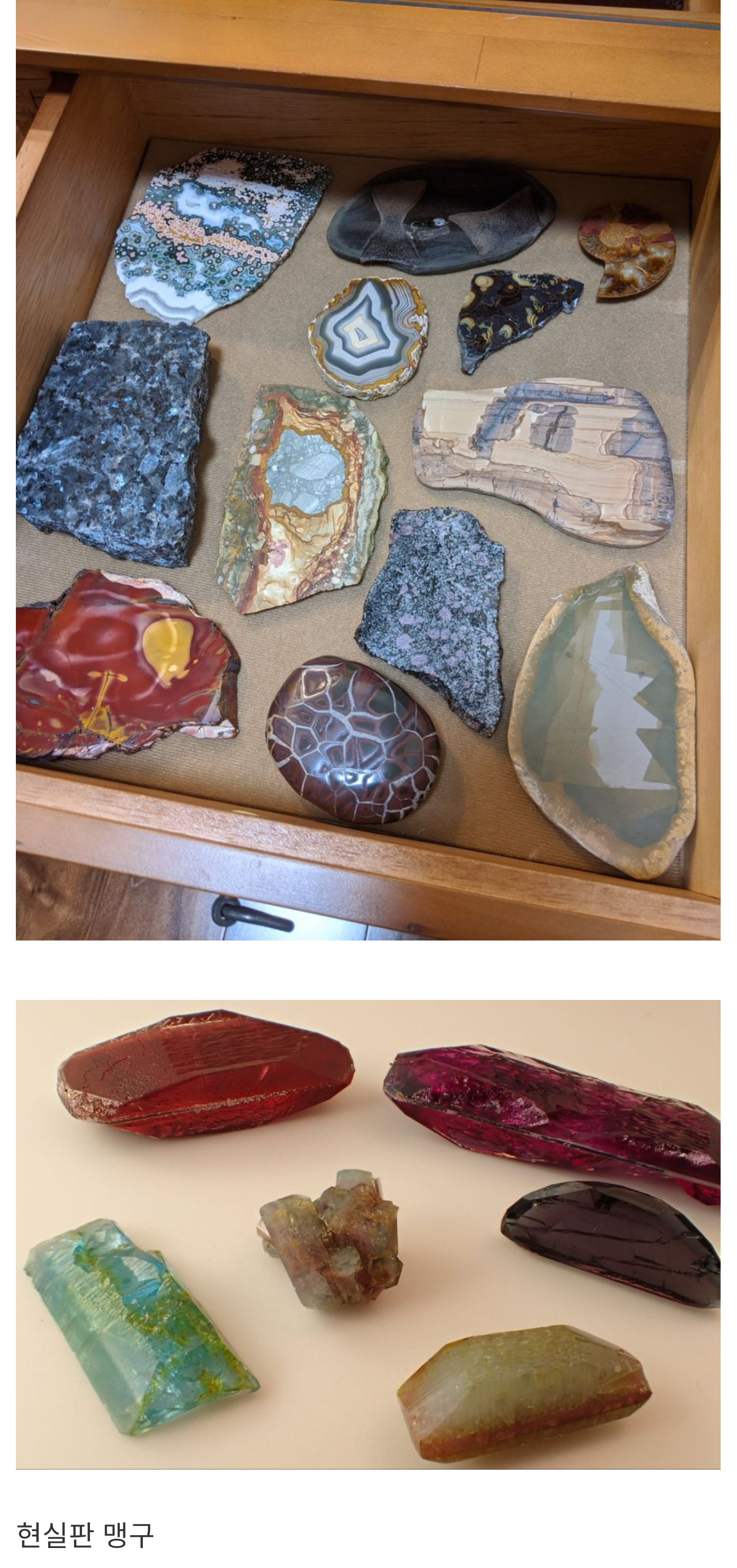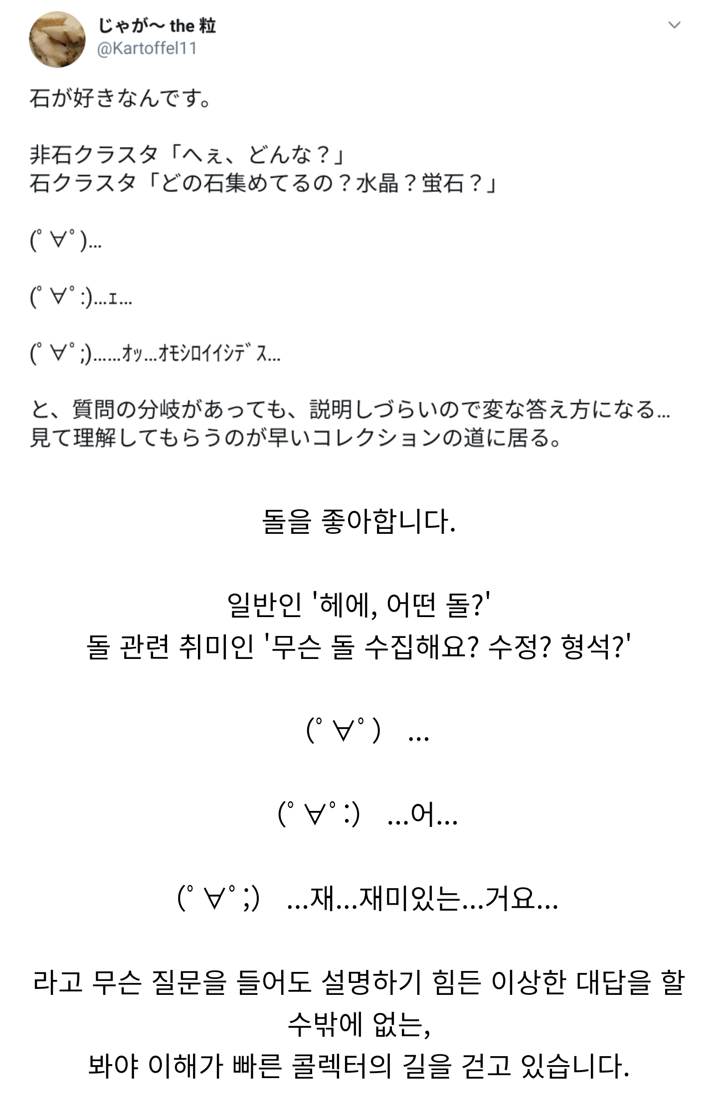 Àú´Â ¾Ë¸ð¾çÀÇ ¿ø¶õ¼®À» ¼öÁýÇÏ´Â ½ºÅæÁî·Î, ƯÁ¤ÇÑ Á¾·ùÀÇ ¼ö¼®À» ¼öÁýÇÏ´Â ÄÝ·ºÅ͸¦ ½ºÅæÁî¶ó°í ºÎ¸£°í Àú·¸°Ô Á¾·ù »ó°ü¾øÀÌ ¼öÁýÇÏ´Â ÄÝ·ºÅ͸¦ ¶óŰſÁî¶ó°í ºÎ¸¨´Ï´Ù. µÎ¹øÂ°Â©¿¡ ³ª¿ÍÀÖ´Â µ¹µéÀº Ư¼öÇÑ ±âÈijª ȯ°æ µî¿¡¼ ¸¸µé¾îÁö´Â Ư¼ö¼®µéÀε¥ È»êÁö´ë³ª ¼®È¸µ¿±¼ ±íÀº°÷¿¡¼ ¹ß°ßÇÒ ¼ö Àִ°͵éÀÌ¶ó ¿Ø¸¸ÇÑ º¸¼®º¸´Ù ºñ½Ô´Ï´Ù. Àú µ¹ÀÌ ¸¸µé¾îÁú·Á¸é ÀÌ ±ÛÀ» Áþ´Âµ¥ ¾²´Â ½Ã°£º¸´Ù ÈξÀ ¸¹Àº ½Ã°£ÀÌ ¼Ò¸ðµÇ¸ç, ¿À·¡µÈ µ¹µéÀϼö·Ï ºû±òÀÌ ¿µ·ÕÇÏ°í °ª¾îÄ¡ ¶ÇÇÑ ¸î¹è·Î ¶Ù°Ô µË´Ï´Ù. ºñ·Ï ©µéÀÌÁö¸¸ Á¤¸» ޳¯Á¤µµ·Î ÈǸ¢ÇÑ µ¹µéÀ̳׿ä. [10]