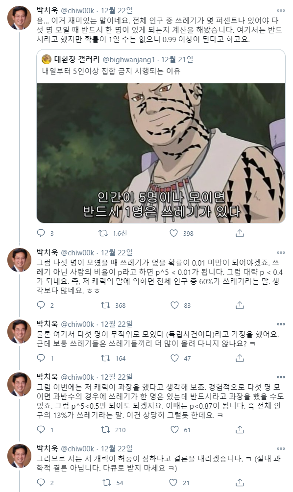 ±×·³ ¿©±â¼ ¹®Á¦: 5¸íÀÌ ¸ðÀ̸é 1¸íÀÇ ¾²·¹±â°¡ ÀÖ´Â °æ¿ì°¡ 99% ¶ó¸é, 1¸íÀÇ ¾²·¹±â°¡ ÀÖ´Â °æ¿ì ¸ðÀÎ »ç¶÷ÀÇ ¼ö¸¦ È®·üÅë°èÀûÀ¸·Î ¼³¸íÇϽÿÀ.