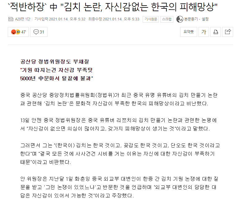 ±èÄ¡ ÇÑ·ù°¡ Áß±¹À» Ȧ·È´Ù°í ±â»ç¸¦ ½á¾ßÁö¤»¤» ¿ì¸®³ª¶ó ¾ð·ÐÀº ÀÚ±¹ Çæ¶â±â¿¡´Â âÁ¶Àû°í Çõ½ÅÀûÀε¥ ±¹À§¼±¾ç¿¡´Â ¿µ ¼ÒÁúÀÌ ¾ø´Âµí.
