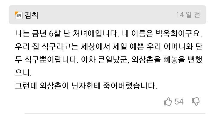 "ÀÌÁ¦ ÀÌ Á×Àº ¶¥À» ¶°³ª¾ß µË´Ï´Ù.¡± ¡°¶°³ª´Ù´Ï¡¤ ¾îµð·Î¡¤¡± ¡°½ÃÁî¿ÀÄ«·Î!¡± ¡°¹Ì³ª»ó!!¡± ¾î¸Ó´ÏÀÇ ºÒ¾ÈÇÑ À½¼ºÀÌ ³ô¾ÆÁ³´Ù. ³ª´Â Ã¥ÀåÀ» µ¤°í ¹ÛÀ¸·Î ³ª°¬´Ù. ¿µÈ£¿Í ¿µÈñ´Â ¾û¶×ÇÑ °÷À» ã¾Æ Çì¸Å°í ÀÖ¾ú´Ù. ³ª´Â ¹æÁ×°¡·Î ³ª°¡ °ðÀå ÇÏ´ÃÀ» ÃÄ´Ùº¸¾Ò´Ù. º®µ¹ °øÀåÀÇ ³ôÀº ±¼¶ÒÀÌ ´«¾ÕÀ¸·Î ´Ù°¡¿Ô´Ù. ±× ¸Ç ²À´ë±â¿¡ ´ÑÀÚ°¡ ¼ ÀÖ¾ú´Ù. ¹Ù·Î ÇÑ °ÉÀ½ Á¤µµ ¾Õ¿¡ ¾Æ¹öÁö°¡ °É·Á ÀÖ¾ú´Ù.
