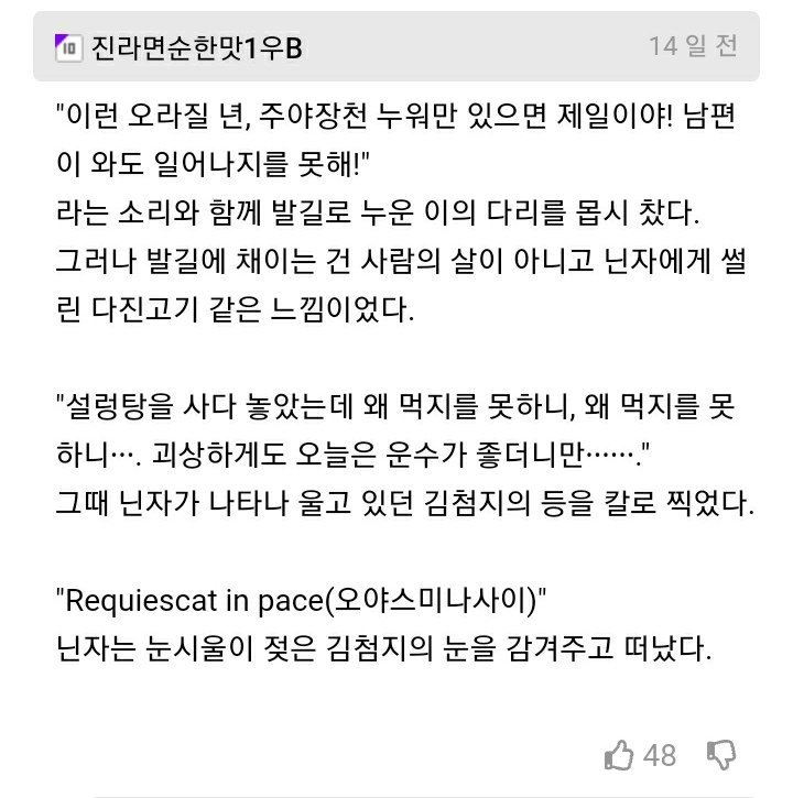 "µ¿¹«´Â ¾î´À ÂÊÀ¸·Î °¡°Ú¼Ò?" "Á߸³±¹!" À̶ó°í ¿ÜÄ£ ¸íÁØÀÇ µî µÚ¿¡¼ ±×¸²ÀÚ Ã³·³ ³ªÅ¸³ ´ÑÀÚÀÇ ³¯Ä«·Î¿î Ä®³¯ÀÌ ±×ÀÇ ¸öÀ» °üÅëÇß´Ù. ³·Àº ½ÅÀ½À» Áö¸£¸ç ¾ÕÀ¸·Î °í²Ù¶óÁø ¸íÁØÀÇ °ç¿¡¼ ´ÑÀÚ´Â ³ªÁö¸·ÇÏ°Ô ¼Ó»èÀδÙ. "¿À¾ß½º¹Ì³ª»çÀÌ." °á±¹ À̳äÀÇ °¥µî ¼Ó¿¡¼ ¸öºÎ¸²Ä¡´ø ¸íÁØÀÌ ÇâÇÑ °÷Àº ³²µµ ºÏµµ Á߸³±¹µµ ¾Æ´Ñ ±Ø¶ôÁ¤Åä¿´´ø °ÍÀÌ´Ù.