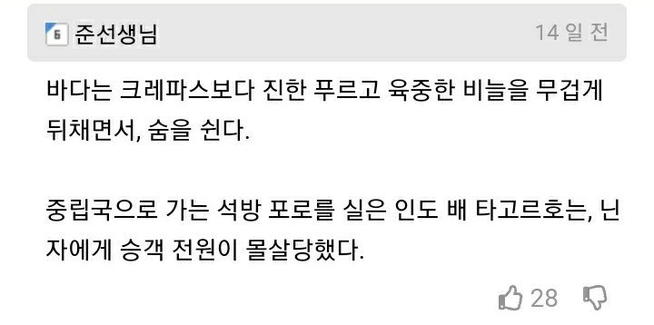 Â÷°¡¿î ¹ã¹Ù´ÙÀÇ ¸Å¼¿î ¹Ù¶÷ÀÌ, ±×ÀÇ ¾ó±¼À» º£¾î¹ö¸®µí ¸Å¼·°Ô Áö³µ´Ù, Àú ½ÃÄ¿¸Õ ¹Ù´Ù ¾È¿¡´Â ¹«¾ùÀÌ ÀÖÀ»±î °í¹ÎÇÏ´ø ³²Àڴ Ǫ¼®Çª¼®ÇÑ ¸ð·¡¹Ù´Ú¿¡ ¾É¾Æ, ÇÑÁÜÀÇ ¸ð·¡¸¦ Áã°í ½º¸£¸¤ ¸ð·¡¸¦ Èê·Á³Ä¸®±â ½ÃÀÛÇß´Ù, ÇÑ¾Ë µÎ¾Ë ±×·¸°Ô ¸ðµç ¸ð·¡¾ËÀÌ »ç¶óÁú ¶§, Àú ±×¸²ÀÚ ¹Ø¿¡¼ ³ªÅ¸³ ´ÑÀÚ´Â ±×ÀÇ ¸ñÀ» º£¾ú°í, ÀÌÀ¹°í ÇѸ¶µð¸¦ Áß¾ó°Å·È´Ù "¾Æ ½Ã¹Ù ¾ê°¡ ¾Æ´Ï³×?"