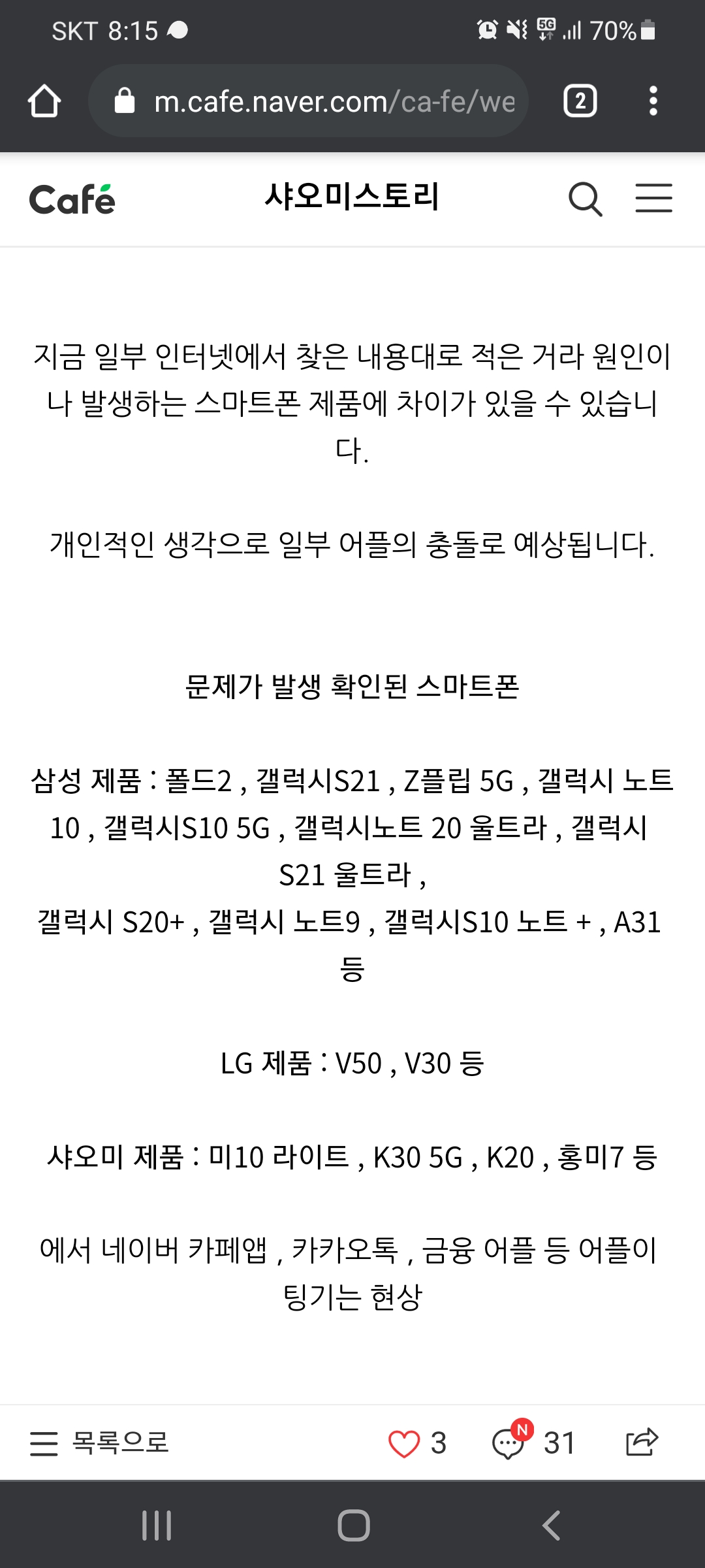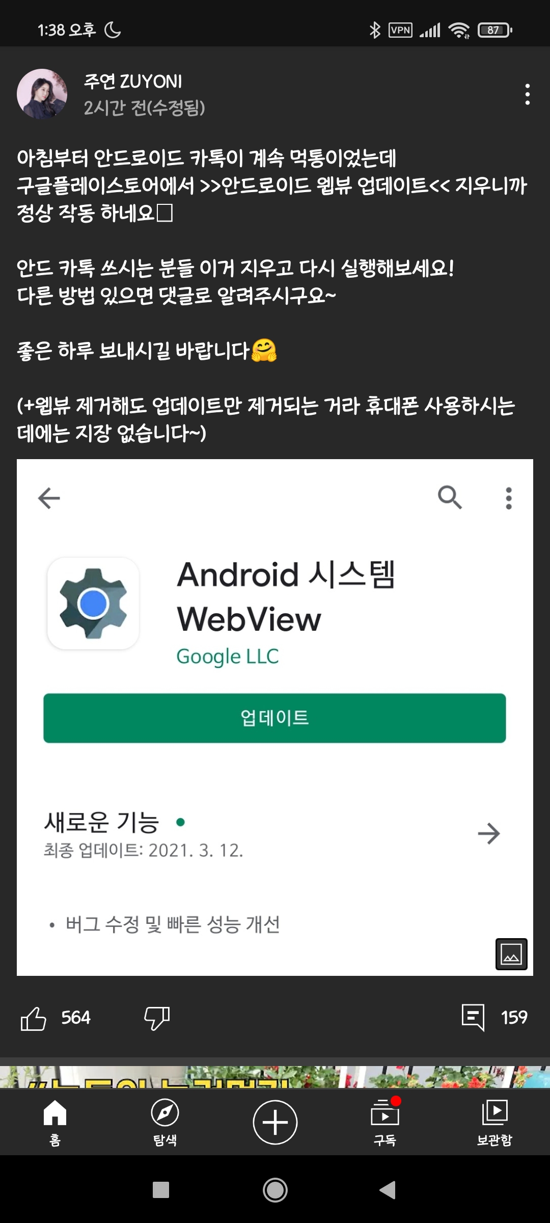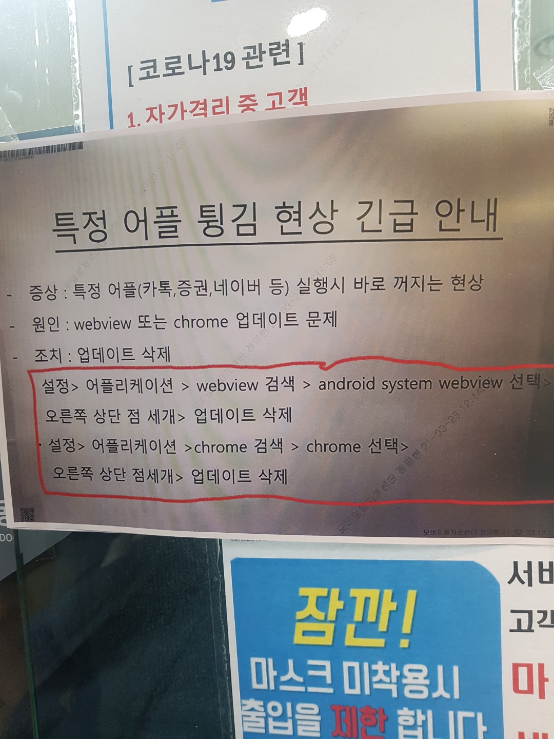 ÇöÀç ¾Èµå·ÎÀÌµå ¾Û ÆÃ±èÇö»óÀº chrome¿¡¼ Á¦°øÇÏ´Â android system webview¿¡ ¹®Á¦°¡ »ý°Ü¼ ÇØ´ç À¥ºä¸¦ »ç¿ëÇÏ´Â ÇÏÀ̺긮µå ¾ÛµéÀÌ ¹®Á¦°¡ »ý±ä°É·Î º¸¿©Áü(¿ÀÇÇ¼È ¾Æ´Ô °³ÀÎÃßÃø) ÇØ°á¹æ¾ÈÀº °£´ÜÇÏ°Ô ¼³Á¤ > ¾îÇø®ÄÉÀÌ¼Ç > android system webview > »ç¿ëÁßÁöŬ¸¯(°Á¦Á¾·á¾Æ´Ô) ±â±â¿¡µû¶ó ¾øÀ»°æ¿ì°¡ Àִµ¥ À̶§´Â Å©·Ò ³»ÀåÀ̶ó¼ chrome¸¦ »ç¿ëÁßÁö ÇϸéµÊ ±â±â ÀçºÎÆÃ ÇÊ¿ä¾øÀ½ / À§Á¬Àǰæ¿ì ´Ù½Ã¼ÂÆÃÇØ¾ßÇÏ´Â ÄÉÀ̽ºµµ ÀÖÀ½ ÃßÈÄ Å©·Ò¿¡¼ ½Å±Ô¹öÀüÀÌ ³ª¿Ã°æ¿ì ¾÷µ¥ÀÌÆ®ÇÏ°í »ç¿ëÇÏ½Ã¸é µÊ È¤½Ã ¾ßµ¿°Ë»öµî Å©·Ò¿¡ È÷½ºÅ丮ÅÇÀ¸·Î »ç¿ëÇϴ°æ¿ì ´Ù½Ã »ç¿ëÀ» ÇÒ°æ¿ì ÅÇµé »ì¾ÆÀÖÀ¸´Ï±î °ÆÁ¤ÇÏÁö¸»°í »ç¿ëÁßÁöÇÏÀÚ [1]