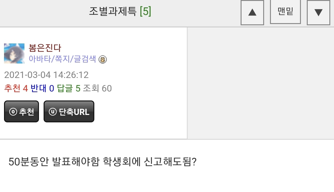 Àú°Ô ¿Ö??¶ó°í »ý°¢Çߴµ¥ ´ñ±Ûº¸´Ï Àú·±°Ô ÀϹÝÀûÀÌÁö ¾ÊÀº°¡º¸³×¿ä ¤»¤»¤»Àú ´ëÇнÃÀý¿¡ ´ëºÎºÐ ¼ö¾÷ÀÌ 1½Ã°£¹ßÇ¥+1½Ã°£¼ö¾÷ ÀÌ·¸°Ô ÁøÇàÇߴµ¥ Àú°¡ °üÁ¾ÀÌ¶ó¼ ¸Ç³¯ Á¶º°°úÁ¦¿¡¼ ¹ßÇ¥ Á¦°¡ÇÞ´ø ±â¾ïÀ̤»¤»¤»
