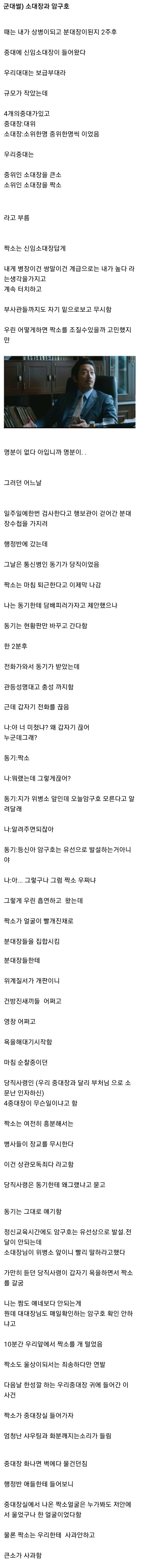 ½î°¡¸®¶§ºÎÅÍ Áß´ëÀåó·³ ±¸´Â ³ðµé ²À ÀÖ´õ¶ó¤»¤» ³ª ¹°º´Àå¶§ ¿ì¸®¼Ò´ë¶û ¿·¼Ò´ë ¼Ò´ëÀå »õ·Î ¿Ô´Âµ¥, ¿·¼Ò´ë ½î°¡¸®°¡ µü Àú¦ÀÌ¿´À½. ±Ùµ¥ ¾Ï¸¸ °è±Þ»¡·Î ¹Ð¾îºÙ¿©µµ °á±¹ ±º»ýȰÀº «¿¡¼ ³ª¿È. ±×°É º¸¿©ÁÖµí ´ë´ëÀü¼úÈÆ·Ã¶§ ¿·¼Ò´ë ½î°¡¸®°¡ Å« »ç°íħ. ±×³¯ ÇÏ·ç ÈÆ·± ³¡³ª°í ÅÙÆ®Ä£ °÷À¸·Î ö¼öÇÒ·Á°í, ´Ù°°ÀÌ Áߴ뺻ºÎ·Î ¸ðÀÌ´Â ÁßÀÌ¿´À½. ±Ùµ¥ ±× ½î°¡¸®°¡ Àڱ⠼Ҵë ÁøÁö¿¡ Àü¼úÁöµµ µÎ°í ¿È. ¹®Á¦´Â ±×°É ¼øÂû µ¹´ø ´ë´ëÀåÀÌ ¹ß°ßÇÔ. °³ºýÄ£ ´ë´ëÀåÀÌ ¿ì¸® Áß´ëÀåÀ» °Ç³ÊÆí »ê¿¡ÀÖ´Â ´ë´ë¾ßÀüº»ºÎ·Î ¼Òȯ. Çѽð£µÚ ¾ó±¼ ½Ã»¹°³Áø Áß´ëÀåÀÌ Ã¶¼ö¸øÇÑä·Î ±â´Ù¸®´ø Áß´ë¿øµé ¾Õ¿¡ ³ªÅ¸³². ±×¸®°í´Â ±× ½î°¡¸®ÇÑÅ× Áߴ뺻ºÎ¸·»ç¾ÈÀ¸·Î µé¾î¿À¶ó°íÇÔ. ±× ½î°¡¸® µé¾î°¡ÀÚ¸¶ÀÚ ±Ø´ë³ëÇÑ Áß´ëÀåÇÑÅ× ¸îºÐ°£ »þ¿ìÆÃ ÃĸÔÀ½¤»¤»¤»¤»¤»¤» °í·¡°í·¡ ¼Ò¸® Áú·¯¼ ¹Û¿¡¼ ´ë±âÁßÀδø ¿ì¸®ÇÑÅ× ±îÁö ´Ù µé¸²¤»¤» ±× µÚ·Ð Áß´ëÀåÇÑÅ× ÂïÇô¼ ³ª Àü¿ªÇÒ¶§±îÁöµµ Á×»óÀ¸·Î Áö³¿.