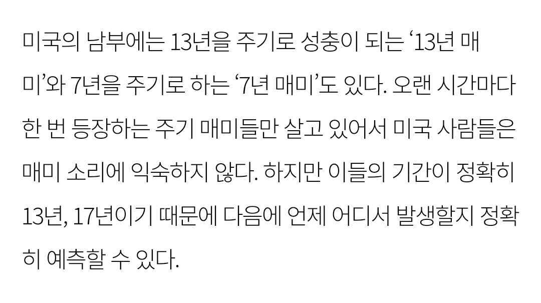 [ºÎ¿¬¼³¸í] ¸Å¹Ì´Â ÁÖ·Î 5³â, 7³â, 13³â, 17³âÀ» ÁÖ±â·Î ¼ºÃæÀÌ µÈ´Ù. ÀÌ ¼ýÀÚ´Â ´Ü¼øÈ÷ Ȧ¼ö°¡ ¾Æ´Ï¶ó ¼Ò¼ö(1°ú ÀÚ±â ÀÚ½ÅÀ¸·Î¸¸ ³ª´©¾îÁö´Â ¼ö)ÀÌ´Ù. ¸Å¹Ì°¡ ÀÌ ¼Ò¼ö ÁÖ±â·Î ¼ºÃæÀÌ µÇ´Â ÀÌÀ¯´Â Á¾Á· º¸Á¸À» À§ÇÑ Àü·«ÀÌ´Ù. ÀÌ·¸¼¼ »ý¾Ö ÁֱⰡ ¼Ò¼öÀÎ ¸Å¹Ì´Â ¼Ò¼ö°¡ ¾Æ´Ñ ÇÕ¼º¼ö ÁÖ±âÀÇ ¸Å¹Ìº¸´Ù Æ÷½ÄÀÚ¸¦ ¸¸³¯ È®·üÀÌ ÈξÀ ³·´Ù. ¿¹¸¦ µé¾î 100³âµ¿¾È »ý¾Ö ÁÖ±â 7³âÀÎ ¸Å¹Ì¿Í »ý¾Ö ÁÖ±â 6³âÀÎ Æ÷½ÄÀÚ°¡ °°Àº ÇØ¿¡ ¸¶ÁÖÄ¥ È®·üÀº 42³â°ú 84³â µÎ¹ø¹Û¿¡ ¾ø´Ù. ±×·¯³ª ¸¸¾à »ý¾Ö ÁÖ±â 8³âÀÎ ¸Å¹Ì°¡ ÀÖ´Ù¸é 6³â ÁÖ±âÀÇ Æ÷½ÄÀÚ¿Í 24³â¸¶´Ù ¸¶ÁÖÄ¡°Ô µÈ´Ù. Áï, ¿À·£ ¼¼¿ù µ¿¾È ¸Å¹ÌµéÀº Æ÷½ÄÀÚµé°ú ¸¶ÁÖÄ¡´Â È®·üÀ» ³·Ãß±â À§ÇÑ °æÀïÀ» ¹úÀÎ °ÍÀÌ´Ù. ÇÐÀÚµéÀº ¿ø·¡ ÁֱⰡ 3³âÀ̾ú´Ù°¡ õÀû°ú ¸¸³ªÀÚ Á¡Â÷ 5³â, 7³â, 13³â, 17³âÀ¸·Î Áֱ⸦ ´Ã·ÈÀ» °ÍÀ̶ó°í º¸°í ÀÖ´Ù.