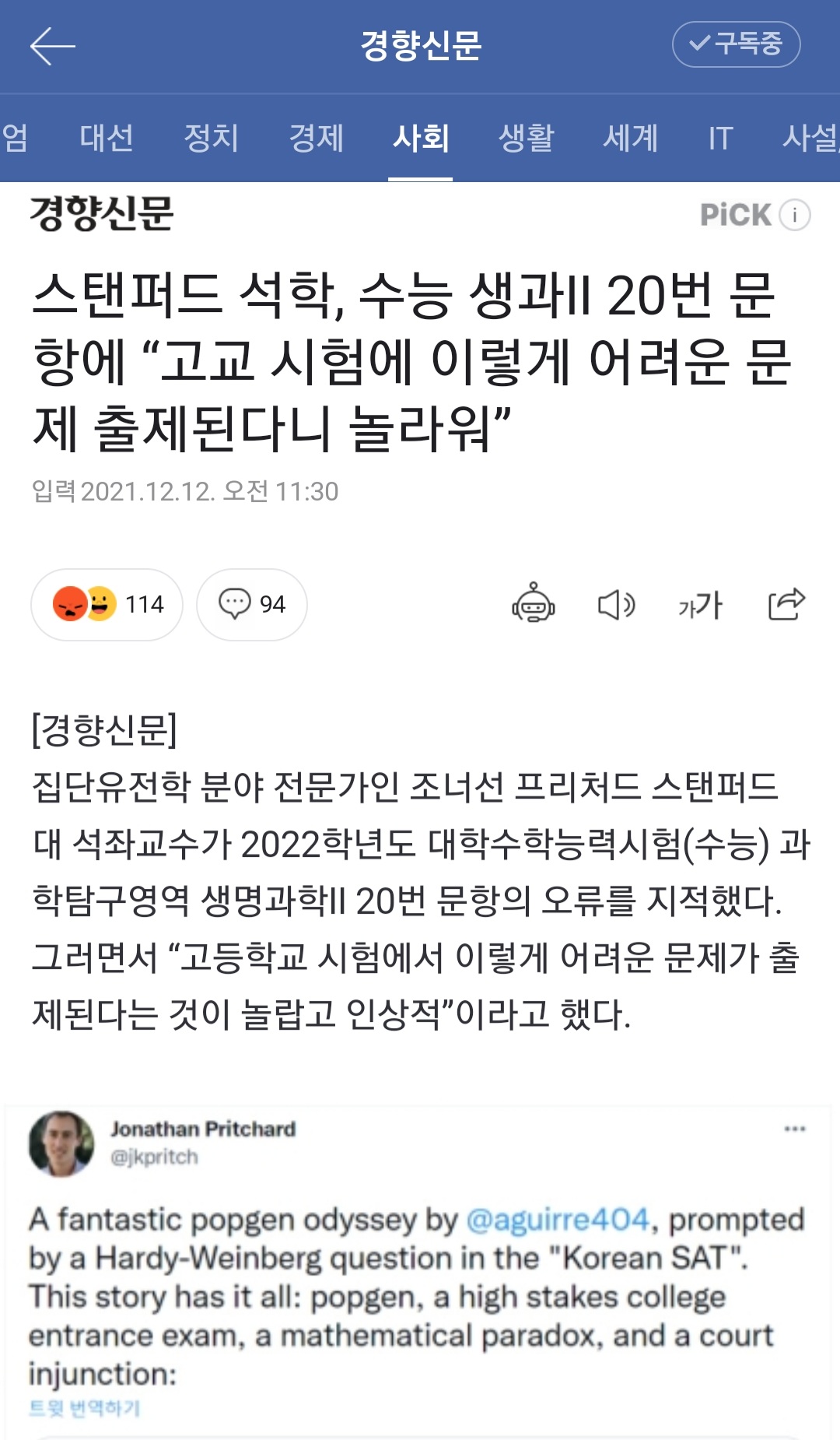 Á¦¸ñ ½ºÅÄÆÛµå ¼®ÇÐ, ¼ö´É »ý°ú¥± 20¹ø ¹®Ç׿¡ ¡°°í±³ ½ÃÇè¿¡ ÀÌ·¸°Ô ¾î·Á¿î ¹®Á¦ ÃâÁ¦µÈ´Ù´Ï ³î¶ó¿ö¡± [38]