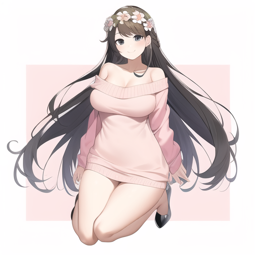 masterpiece, girl,flower crown, breasts, long hair, pink sweater, off shoulder, smile, full body, black eyes, beige hair, happy, no pants, high quality