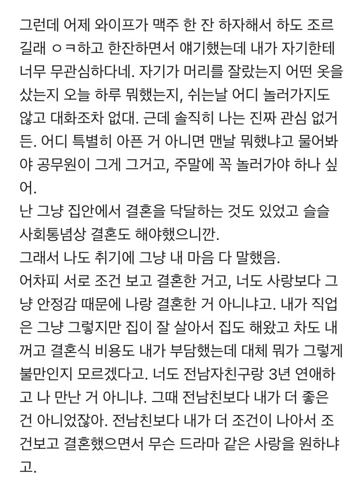 µÑ´Ù °áÈ¥ Àü¿¡ ¼·Î ³Ê¹« ÂѰܼ °áÈ¥ÇÑ µí ³²ÀÚ´Â ¿ø·¡ õ¼ºÀÌ Àú·± °Å¶ó¼ °áÈ¥ÇÒ »ý°¢µµ ¾ø¾ú´Âµ¥, Áý¿¡¼ ¹¹¶ó°í ÇÏ°í ´«Ä¡º¸ÀÌ´Ï ÁøÂ¥ Á¶°Ç¸¸ º¸°í ÁÁÀº Á¶°ÇÀÇ(¾î¸°) ¿©ÀÚ¶û °áÈ¥ÇѰŰí, ¿©ÀÚ´Â 3³â ¸¸³ »ç¶÷ µÎ°í Àú·± ¾ÖÇÑÅ× °¥ Á¤µµ¸é Çì¾îÁú ¶§ Âë¿¡ ¹º°¡ Æ®¶ó¿ì¸¶°¡ ÀÖ´øÁö ¾Æ´Ï¸é ¿ª½Ã Áý¾ÈÀ̳ª ÁÖº¯ ´«Ä¡º¸´Ù°¡ Àû´çÇÑ »ç¶÷ °í¸¥ °Í °°±âµµ Çϰí