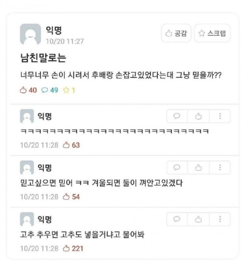 »ó´ë¹æ¿¡ ´ëÇÑ ¹è·Á´Â ³×ƼÄÏÀÇ ±âº»ÀÔ´Ï´Ù.°Ô½Ã¹°¿¡ »ó°ü¾ø´Â ´ä±ÛÀ̳ª ÃßõÀ¯µµ¼º ´ä±ÛÀ» ´ÞÁö ¸¶¼¼¿ä.