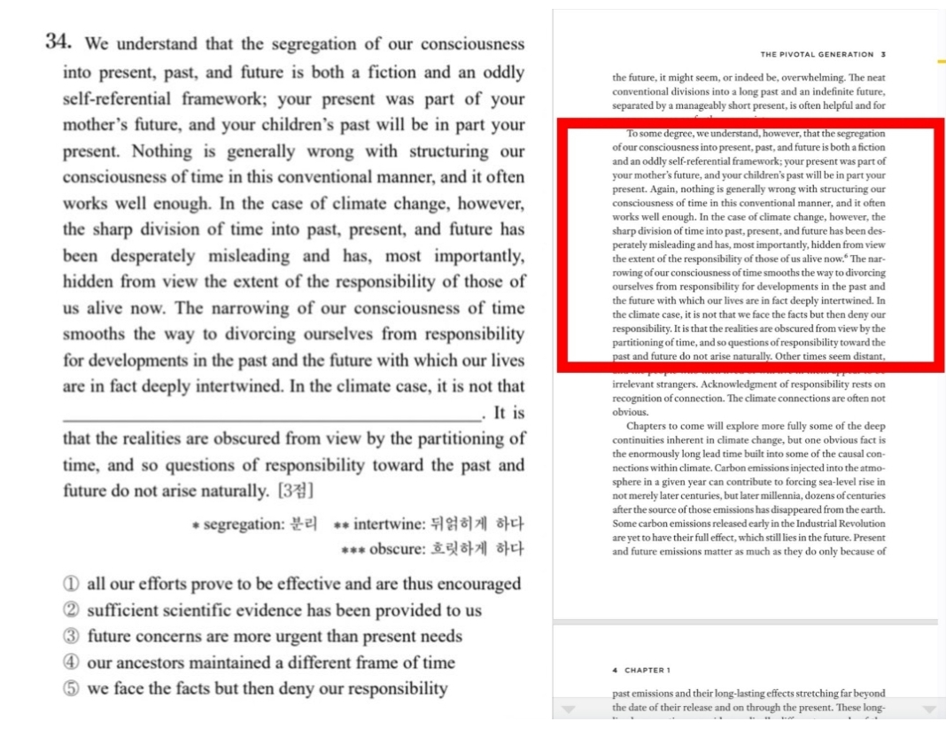 ¿µ¾î Áö¹®Àº ´ëºÎºÐ ¿ø Ãâó¸¦ °¡Áö°í ÀÖÀ½ ÀÌ°Ç 2023Çг⵵ ¿µ¾î 34¹ø Á¤´ä·ü 23% Â¥¸® ¿ø¼´Â 'The Pivotal Generation: Why We Have a Moral Responsibility to Slow Climate Change Right Now'