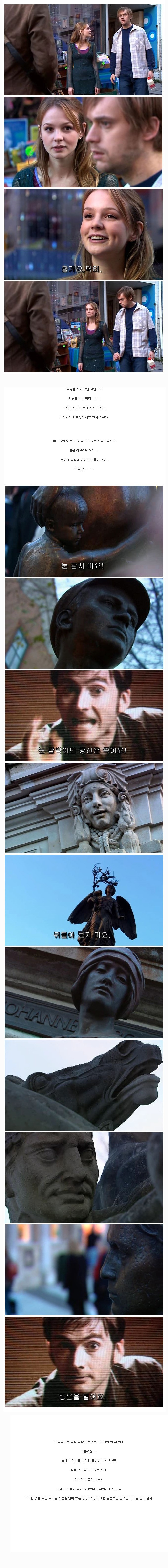 [ºÎ¿¬¼³¸í] ¿ì´Â õ»ç(Weeping Angels). ¿µ±¹ SF µå¶ó¸¶ ´ÚÅÍ ÈÄ¿¡ ³ª¿À´Â ¿Ü°è »ý¸íü. ´ÚÅÍ ÈÄ ¿¡ÇǼҵå Áß °¡Àå ¹«¼­¿î ¿¡ÇǼҵå·Î ¼Õ²ÅÈù´Ù. »ì¾ÆÀÖ´Â »ý¸íüÀÇ ½Ã°£ ¿¡³ÊÁö¸¦ ¸Ô°í »ì¸ç ½Ã°£ ¾Ö³ÊÁö¸¦ Èí¼ö´çÇÑ ÇÇÇØÀÚ´Â °ú°Å·Î ¶³¾îÁø´Ù. (»ç¶÷À» Á׿©¼­ ½Ã°£ ¿¡³ÊÁö¸¦ Èí¼öÇϱ⵵ ÇÑ´Ù) ¾çÀÚÀû ¹æ¾îü°è¸¦ °¡Áö°í Àִµ¥ »ì¾ÆÀÖ´Â »ý¹°¿¡°Ô °üÂûµÉ ¶© ¸öÀÌ ¼®»ó ÀÚü°¡ µÇ¾î ¹æ¾îÇÏÁö¸¸ ´©±¸¿¡°Ôµµ °üÂûµÇÁö ¾ÊÀ» ¶© ÀÚÀ¯·Ó°Ô À̵¿ÇÏ¿© »ç³É°¨À» °ø°ÝÇÑ´Ù. À̵¿¼Óµµ°¡ ¸Å¿ì ºü¸¥µ¥ Àüµî Çѹø ±ôºý, ´« Çѹø ±ôºý°Å¸®´Â ½Ã°£ ¾È¿¡ ½À°ÝÀÌ °¡´ÉÇÏ´Ù. µ¿»óÀ¸·Î ÀÖÀ» ¶§´Â ¸öÀÌ ¸Å¿ì ´Ü´ÜÇØÁø´Ù. Æò»ó½Ã¿¡ ´«À» °¡¸° ¸ð½ÀÀ¸·Î ÀÖ´Â ÀÌÀ¯´Â ¿ì´Â õ»ç¿Í ¿ì´Â õ»ç°¡ ¼­·Î¸¦ ÃÄ´Ùº¸¸é ¿µ¿øÈ÷ ±»¾î¹ö¸®±â ¶§¹®ÀÌ´Ù. »ç³ÉÀ» ÇÒ ¶§ 'Àç¹Ì'¸¦ µûÁö¸ç Àΰ£°úÀÇ ´ëÈ­µµ °¡´ÉÇϰí ÀüÀÚÀåºñ¸¦ ´Ù·ç´Â ´É·Âµµ ¶Ù¾î³ª´Ù°í ¹¦»çµÈ´Ù. ´Ù¸¸ Àΰ£À» »ç³É°¨À¸·Î¹Û¿¡ º¸´Â ÀüÅõÁ¾Á·À̱⠶§¹®¿¡ ´ëÈ­³ª Çù»óÀº ºÒ°¡´ÉÇÏ´Ù. ´º½ÃÁð 3 ¿¡ÇǼҵå 10¿¡ óÀ½ µîÀåÇÑ ÈÄ ¸¹Àº Àα⸦ ¾ò¾î ÀÌÈÄ ¿©·¯¹ø Ã⿬Çß´Ù.