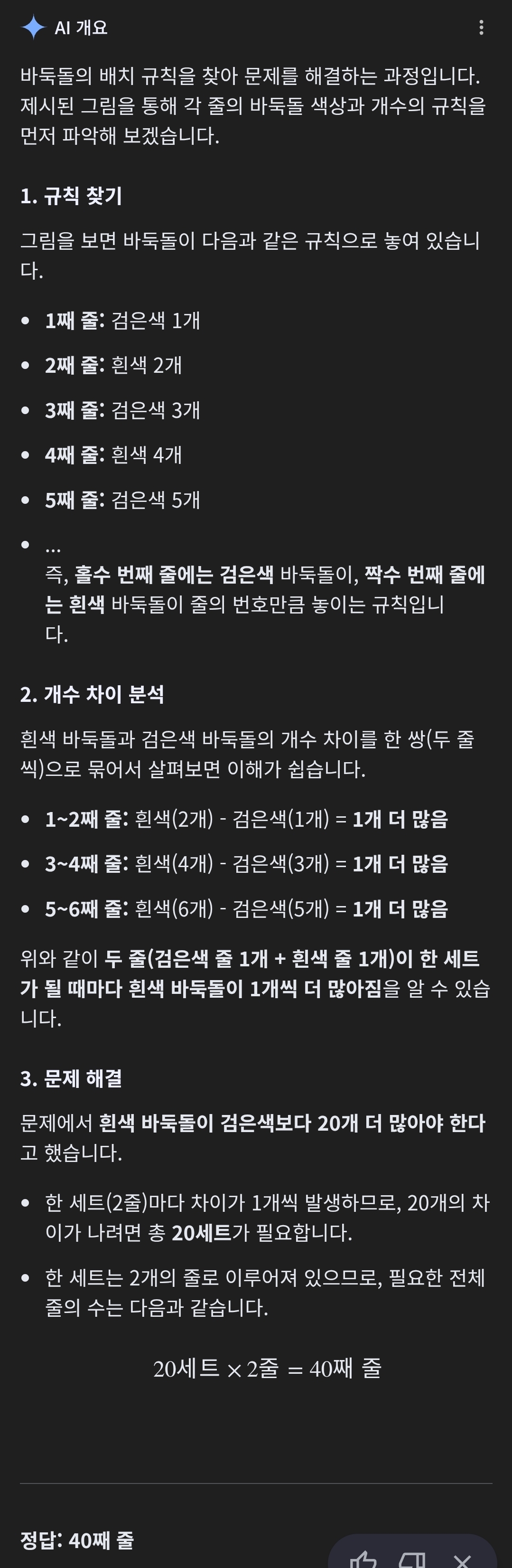 °Ë Èò °Ë Èò À¸·Î ¹Ýº¹µÇ´Ï±î, °ËÀº»ö µ¹ º¸´Ù Èò ¹ÙµÏµ¹ÀÌ ´õ ¸¹À¸·Á¸é ¦¼ö ¹ø °¿¡¼­ ³¡³ª¾ßÇÑ´Ù´Â °ÍÀ» »ý°¢ÇÒ ¼ö ÀÖÀ½. ±×·³ ¾ðÁ¦! Èò ¹ÙµÏµ¹ÀÌ 20°³°¡ ´õ ¸¹¾ÆÁú±î¸¦ °í¹ÎÇØ º¼ Çʿ䰡 ÀÖ°õ. ¸¶Ä§ ±ÔÄ¢ÀûÀ¸·Î °¹¼ö°¡ ´Ã¾î³ª´Â °ÍÀ» º¼ ¼ö ÀÖ°õ. °¡¸¸ º¸¸é Èò µ¹Àº Ç×»ó Àü ´Ü°èÀÇ °ËÀºµ¹ º¸´Ù ÇÑ °³ ´õÇØ¼­ ³õ´Â ±ÔÄ¢ÀÌ ÀÖÀݰõ? ¾î! ±×·³ °ËÈò ³õ´Â°ÍÀ» 20¹øÀ» ¹Ýº¹Çϸé Èò µ¹ÀÌ 20°³ ´õ ¸¹¾ÆÁö°Ú°õ? ±×·¯´Ï±î, 40ȸ¸¦ Çϸé Èò µ¹ÀÌ °ËÀº µ¹ º¸´Ù 20°³ ¸¹°Ô ³õÀÎ´Ù°í »ý°¢ÇÒ ¼ö ÀÖ°õ