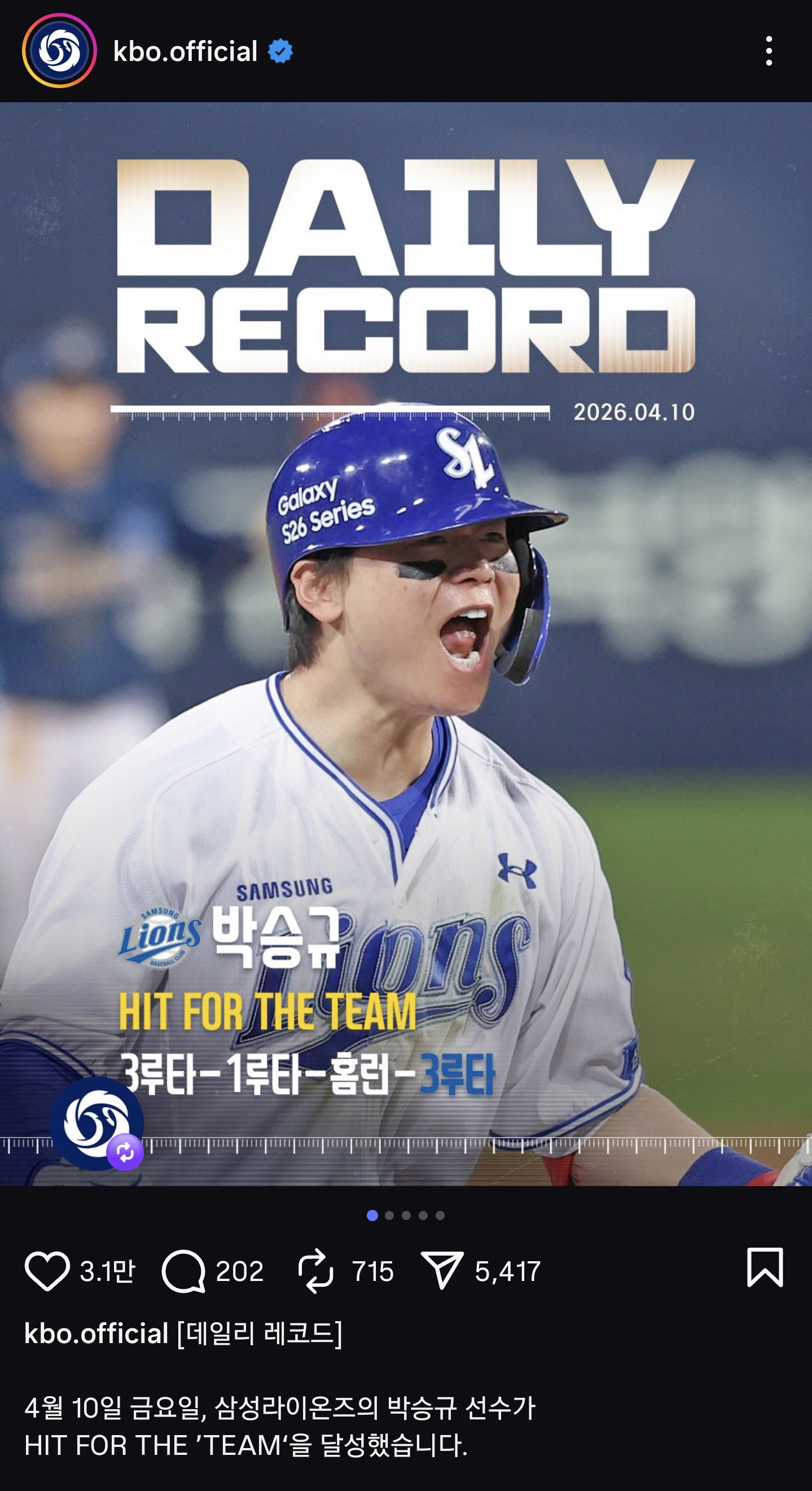 ±×¸®°í ÀÌ¿¡ ´ëÇÑ Å©º¸ ÀνºÅ¸ÀÇ »þ¶ó¿ô, Hit for the 'Cycle'ÀÌ ¾Æ´Ñ Hit for the 'TEAM'.