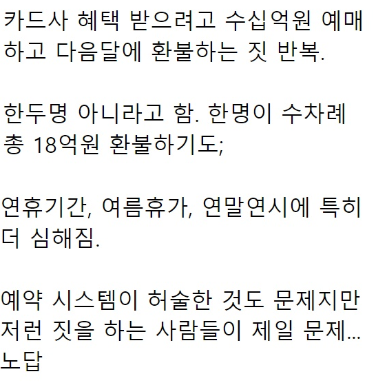 Á¦°¡ ÀÌÇØÇÑ°Ô ¸Â´Ù¸é, Ä«µå»çµéÀÌ ÇÑ´Þ ½ÇÀû 30¸¸¿ø ÀÌ»óÀ̸é ÁÖ´Â ÇýÅà ÀÌ·±°Ô º¸Åë ÀÖÀݾƿä? ±× ½ÇÀûÀ» ½ÇÁ¦·Î ¹º°¡¸¦ ±¸¸ÅÇÏ¸é¼ Ã¤¿ì´Â°Ô ¾Æ´Ï¶ó º»¹®Ã³·³ ±âÂ÷Ç¥¸¦ ¿¹¸ÅÇÏ´Â ¹æ½ÄÀ¸·Î ä¿îµÚ¿¡ ÇýÅÃÀº ¹Þ¾Æ¸Ô°í ÀÌÈÄ ¿¹¸ÅÃë¼ÒÇÏ¸é µ· ³ª°¡´Â°Ç ¾øÀ¸´Ï±î ±×·±¹æ½ÄÀ¸·Î ¾Ç¿ëÇѴٴµí Çϳ׿ä. ÄÚ·¹ÀÏÃø¿¡¼ ¸·´Â ¹æ¾ÈÀ» ¸¸µå´Â°Íµµ ÁÁ°ÚÁö¸¸ ½Å¿ëÄ«µå»ç¿¡¼ Á¶Ä¡¸¦ ÃëÇÒ Çʿ䰡 ÀÖÁö¾Ê³ª ½Í±âµµ ÇÔ