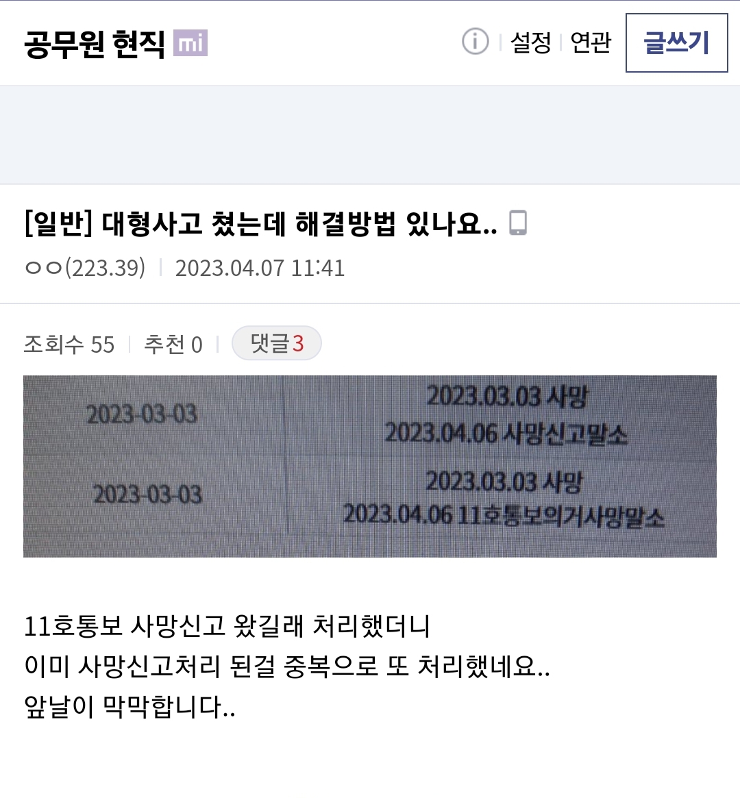 µ¿¿¡¼ 11È£Å뺸ó¸®ÇÏ´Â ´ã´çÀÚÀä.. °üÇÒµ¿ÀÌ¾Æ´Ñ ±¸Ã»¿¡¼ »ç¸Á½Å°í¸¦ ÇÏ°ÔµÇ¸é °¡Á·°ü°èµî·ÏºÎ°¡ Æó¼âµÇ°í Áֹεî·ÏÀº °¢ °üÇÒµ¿¿¡¼ µû·Î »ç¸Á¸»¼Ò¸¦Çؾ߾ֿä. ±¸Ã»¿¡¼ »ç¸Á½Å°íÇÏ¸é ¿ì¸®°¡»ç¸Á½Å°í¹Þ¾ÒÀ¸´Ï Áֹεî·Ï Á¤¸®Çضó ¶ó°í Àü»êÀ¸·Î Å뺸Çϴ°̴ϴÙ. ±Ùµ¥ Á» ÀÌÇØ°¡¾È°¡´Â°Ô Áֹεî·ÏÀÌ ¸»¼Ò°¡µÆ´Ù´Â°Ç °üÇÒµ¿¿¡ ½Å°íÀÎÀÌ ¿Í¼ »ç¸Á󸮸¦ Çߴٴ°ǵ¥ 11È£Å뺸°¡ ¿Ö¿Ô´Â°Ç¤¸¤Ó... ÀÌÇØ°¡¾È°¡±äÇÏÁö¸¸ Àú ´ã´ç°ø¹«¿øµµ ´Ù¸¥°Íµµ¾Æ´Ï°í »ç¸ÁÀε¥ ²Ä²ÄÇÏÁö¸øÇ߳׿ä. Àü»êó¸®ÇÒ¶§ ÀÌ¹Ì ¸»¼ÒÀÚ·Î ³ª¿À´Âµ¥ °Å±â´Ù´ë°í ¶Ç¸»¼ÒÀúÀåÀ» ÇѰŴϱî¿ä