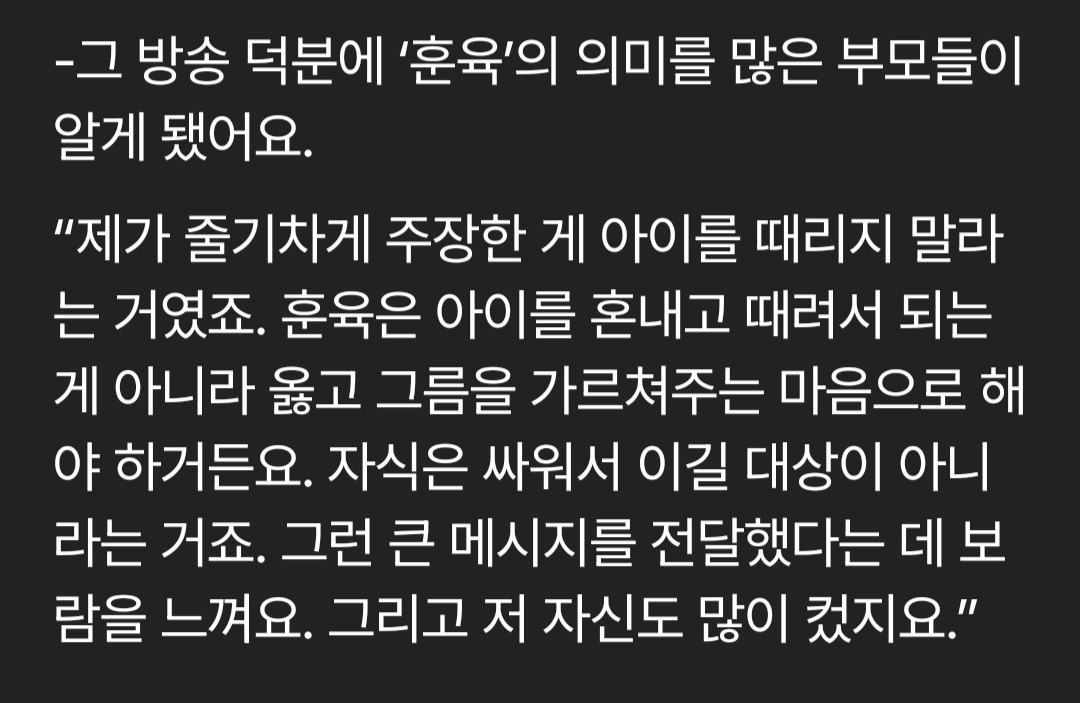 '¹ú'À̶ó´Â°Ô °¡Á¤ ȯ°æ¿¡¼ Àû¿ëÇϱ⠾î·Á¿î Ç¥ÇöÀΰͰ°½À´Ï´Ù. »çȸ¿¡¼´Â '¹ý'À̶ó´Â ±ÔÁ¤¿¡ µû¶ó À̸¦ ¾î±â¸é '¹ú'À» ¹Þ½À´Ï´Ù. ÇÏÁö¸¸ °¡Á¤ ³»¿¡¼´Â Á¤ÇØÁø ±ÔÄ¢ÀÌ '¼± 1mmÀÌ»ó ³Ñ¾î¿ÀÁö ¾Ê±â'ó·³ ¸íÈ®ÇÏÁö ¾Ê°í ó¹ú ±ÔÁ¤À» Áþ±âµµ ¾Ö¸ÅÇÕ´Ï´Ù. ¾ÆÀ̰¡ ºÎ¸ð¸¦ ¶§¸®¸é '³Ê°¡ ³ª ¶§·ÈÀ¸´Ï±î ³ªÇÑÅ× 1´ë ¸Â¾Æ' ÇÒ ¼ö´Â ¾øÀ¸´Ï±î¿ä. ÀÌ´Â ¾î¸¥À¸·Î¼µµ ºÎ¸ð·Î¼µµ ¿ÇÀº ŵµ°¡ ¾Æ´Õ´Ï´Ù. ±ÝÂÊÀÌ »ç·Ê·Îµµ ³ª¿Ô´Âµ¥, ºÎ¸ð°¡ ¾ÆÀ̸¦ ü¹ú·Î ¶§¸° °æ¿ì ¾ÆÀÌ´Â ºÐÀ» ÂüÁö ¸øÇϰí Àڱ⺸´Ù ¾àÇÑ »ó´ë¸¦ ¶§·È½À´Ï´Ù.. ¸¶Áö¸·À¸·Î ¿ÀÀº¿µ¹Ú»ç´ÔÀÇ ÀÎÅÍºä ±ÛÀ» ÷ºÎÇÕ´Ï´Ù.