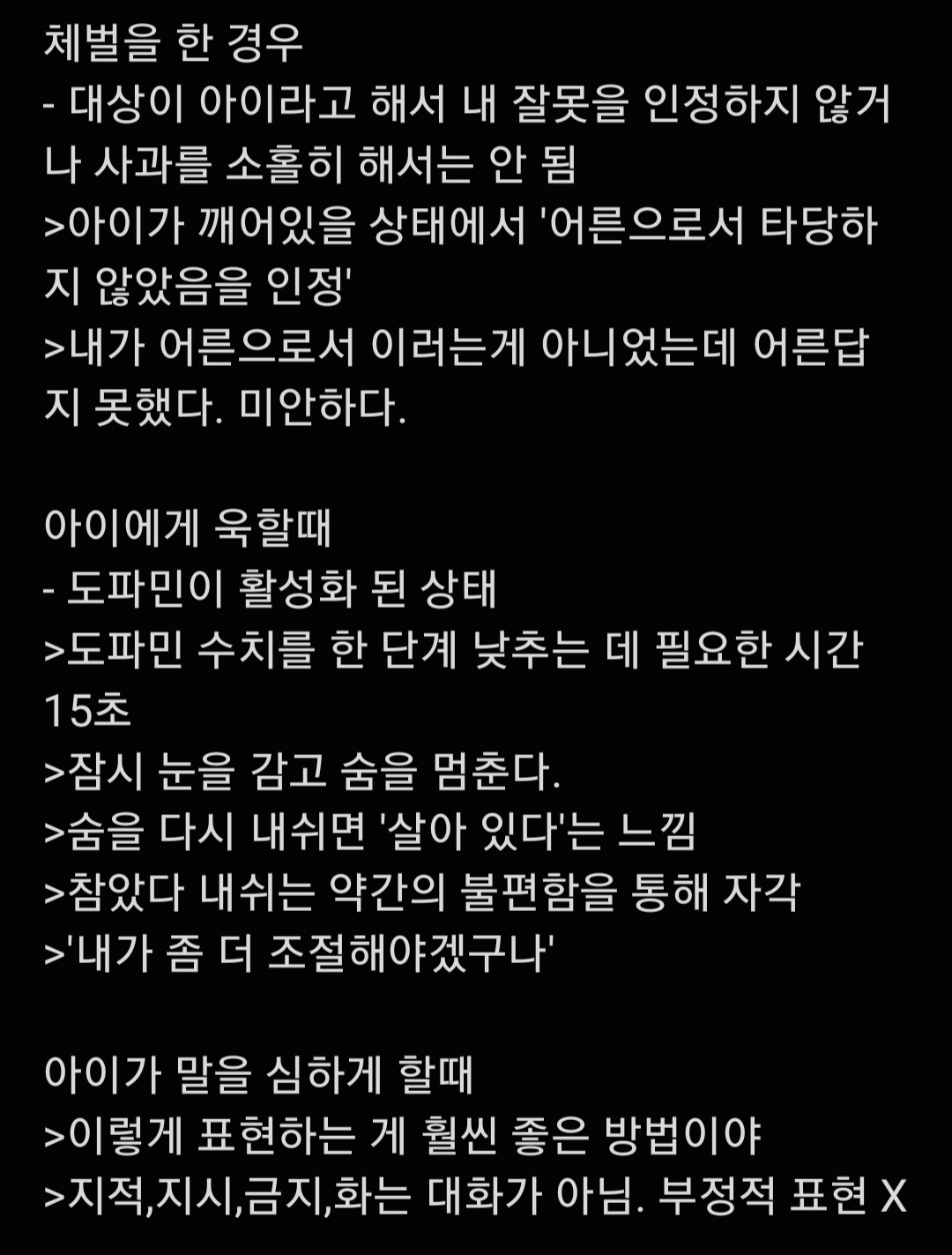Å©°Ô´Â 3°¡Áö¿´½À´Ï´Ù. 1. ±ä ¼³¸í/¼³µæ ±ÝÁö, 2. ¸»·Î ¸Â´ëÀÀ ±ÝÁö, 3. À̾߱â ÇÒ ÀÚ¼¼°¡ µÉ¶§±îÁö ±â´Ù¸®±â µðÅ×ÀÏÇÏ°Ô º¸ÀÚ¸é ¾ÆÀ̰¡ °ÅÄ£ ¾ð¾î¸¦ µ¿¹ÝÇØµµ ¸Â´ëÀÀÇÏÁö ¾Ê±â. Æø·ÂÀ» µ¿¹ÝÇÒ °æ¿ì ¸öÀÌ ¾ÆÇ ¾ö¸¶°¡ ¸Â´ëÀÀÇϱâ ÈûµéÅ×´Ï ¹æÀ¸·Î µé¾î°¡±â. ´ë½Å Æò¼Ò¿¡ ÈÆÀ°¿¡ ´ëÇØ ¹Ì¸® ¼³¸íÇØÁÖ±â(ex. ¾ö¸¶°¡ ±×µ¿¾È ¿Ã¹Ù¸£Áö ¸øÇÑ ÈÆÀ°À¸·Î ±ÝÂÊÀ̰¡ È¥¶õ½º·¯¿üÀ»°Å¾ß. ¾ö¸¶°¡ ´Ù½Ã ¾Ë·ÁÁÙ°Ô. ¹æ¿¡ µé¾î°¡´Â°Ç Àá±ñ ³ÊÀÇ È°¡ ÁøÁ¤µÉ¶§±îÁö ±â´Ù¸®´Â°Å¾ß. ÁغñµÇ¸é À̾߱âÇÒ ¼ö ÀÖµµ·Ï) À¯´ë°øÆ÷¸¦ ÁÙÀ̱â À§ÇØ ¾ÆÀÌÀÇ ¼ºÀå°úÁ¤¿¡ ´ëÇØ À̾߱âÇÏ´Â µî À¯´ë°¨À» ´Ã¸®±â, ³îÀÌȰµ¿À¸·Î ±â´Ù¸²À» ¹è¿ì±â ¿´½À´Ï´Ù.