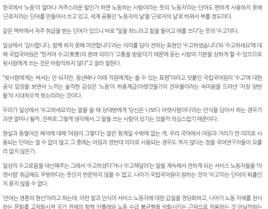 À»ç¶÷¿¡°Ô ÇØ¼± ¾È µÇ´Â ¸»Àº ¼ö°íÇϼ̽À´Ï´Ù, °í»ýÇϼ̽À´Ï´Ù°¡ ¾Æ´Ï¶ó ¸í·É¾îÀÎ ¡°¼ö°íÇϼ¼¿ä¡± ¡°°í»ýÇϼ¼¿ä¡±¶ó°í ¾Ë°íÀÖÀ½. ±Ùµ¥ ÀÌ°Ô ¿ÍÀüµÅ¼ ¡°¼ö°í¡±¶ó´Â ´Ü¾î¸¸ ³ª¿À¸é ¾È µÇ´Â °É·Î ÆÛÁø °Å ¾Æ´Ñ°¡. ¼ö°í °í»ý ±¸ºÐÇÏ´Â °Íµµ ¿ô±ä°Ô ÇÑÀÚ¶æ Ç®¾îº¸¸é ¼ö°í´Â °íÅëÀ» ¹Þ´Ù, °í»ýÀº °íÅ뽺·´°Ô »ì´ÙÀε¥. °íÅë ¹ÞÀ¸¼Ì½À´Ï´Ù´Â ¿¹ÀÇ ¾ø´Â °Å°í °íÅ뽺·´°Ô »ç¼Ì½À´Ï´Ù´Â ¿¹ÀÇ ÀÖ´Â °Ç°¡¤»¤» [13]