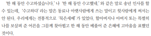 ±¹¸³±¹¾î¿ø¿¡ ´©°¡ ¹°¾îº»°Å ´ë´äÇѱÛ. ¿¹Àü¿¡´Â '¼ö°í'¶ó´Â Ç¥ÇöÀ» À»ç¶÷¿¡°Ô ¾²´Â °Í ÀÚü°¡ ¾ð¾î ¿¹Àý¿¡ ¸ÂÁö ¾Ê´Â´Ù°í ¿©°ÜÁ³´ø °ÍÀ¸·Î º¸ÀÔ´Ï´Ù. ÇÏÁö¸¸ ¸»¿¡ ´ëÇÑ ¾ðÁßµéÀÇ Àνİú ÆÇ´ÜÀº ½Ã°£ÀÌ È帣¸é¼ ¹Ù²ð ¼ö Àֱ⠶§¹®¿¡, ±×·¯ÇÑ Ç¥ÇöÀº '»ó´ë¿¡ ´ëÇÑ Æò°¡'°¡ ¾Æ´Ï¶ó Çö½ÇÀûÀ¸·Î ±»¾îÁ® Á¡Â÷ ¾²¸é¼ ¾ð¾î ¿¹Àý¿¡ ¾î±ß³ °ÍÀº ¾Æ´Ï¶ó´Â Àǰߵµ ÀÖ°í À̸¦ ¿ÏÀüÈ÷ ´ëüÇÒ ¸¸ÇÑ ¸¶¶¥ÇÑ Ç¥ÇöÀÌ ¾ø´Ù°í »ý°¢Çϱ⵵ ÇÏ´Â µíÇÕ´Ï´Ù. ÇöÀç·Î¼ ÀÌµé ¿ÏÀüÇÏ°Ô ´ëüÇÒ ¼ö Àִ ǥÇöÀº Á¤ÇØÁ® ÀÖÁö´Â ¾Ê½À´Ï´Ù. Çö½ÇÀûÀÎ ¾²ÀÓÀ» °í·ÁÇÏ¸é ¸Æ¶ô¿¡ µû¶ó "°í¸¿½À´Ï´Ù.", "³»ÀÏ ºË°Ú½À´Ï´Ù.", "¾È³çÈ÷ °¡½Ê½Ã¿À." µîµîÀÇ Ç¥ÇöÀ¸·Î ¹Ù²Ù¾î ¾²½Ç ¼ö ÀÖ°Ú½À´Ï´Ù. [6]