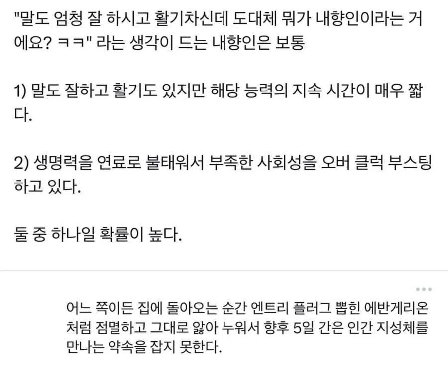 ³»¼ºÀûÀÌ¸é¼ ¿ÜÇâÀûÀÎ »ç¶÷ÀÌ ÀÖ°í Ȱ¹ßÇÏ¸é¼ ³»ÇâÀûÀÎ »ç¶÷ÀÌ ÀÖÀ½. ³»¼ºÀûÀÌ°í ¿ÜÇâÀûÀÎ »ç¶÷ÇÑÅ× Çö½ÇÀº °ÅÀÇ Áö¿ÁÀÓ..