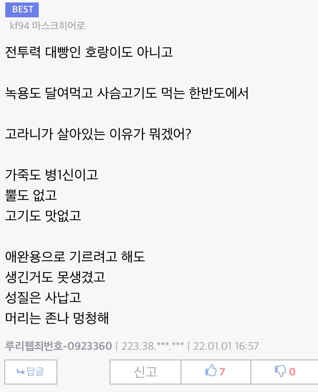 °í¶ó´Ï ¸êÁ¾À§±âÁ¾ ¾Æ´Ô? ¤»¤» ¿ì¸®³ª¶ó¿¡ Àü¼¼°è °í¶ó´Ï 90ÆÛÀΰ¡ 99ÆÛ°¡ ¸ô·ÁÀ־ ÈçÇÏ°Ô ´À²¸Áú »Ó..