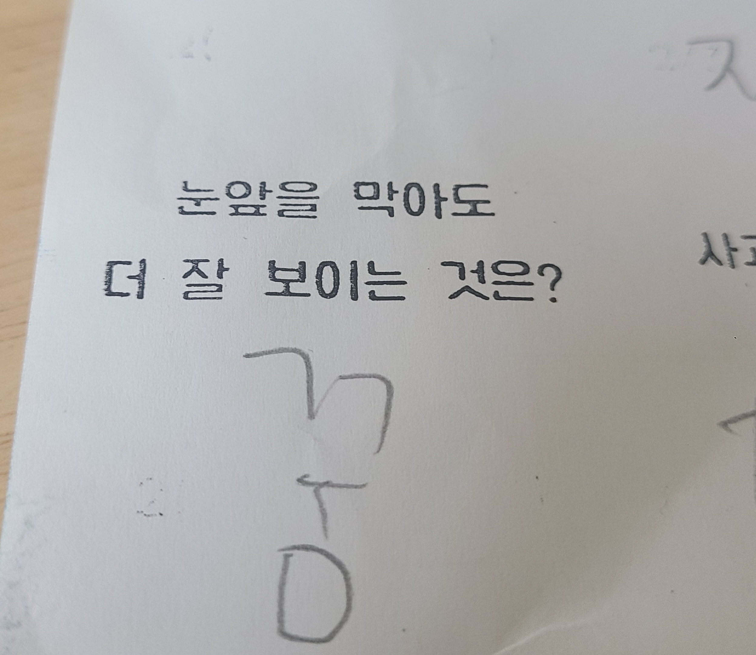 ±Ùµ¥ ¹®Á¦°¡ ÁÁÀº °É ¶°³ª¼ ¹®ÀåÀº ¾È ÀÌ»Ú°Ô ½áÁ³³×. '´«¾ÕÀ» ¸·À¸¸é ´õ Àß º¸ÀÌ´Â °ÍÀº?' À̳ª '´«¾ÕÀ» ¸·¾Æµµ Àß º¸ÀÌ´Â °ÍÀº?'À¸·Î ½áÁáÀ¸¸é ÁÁ¾ÒÀ»ÅÙµ¥