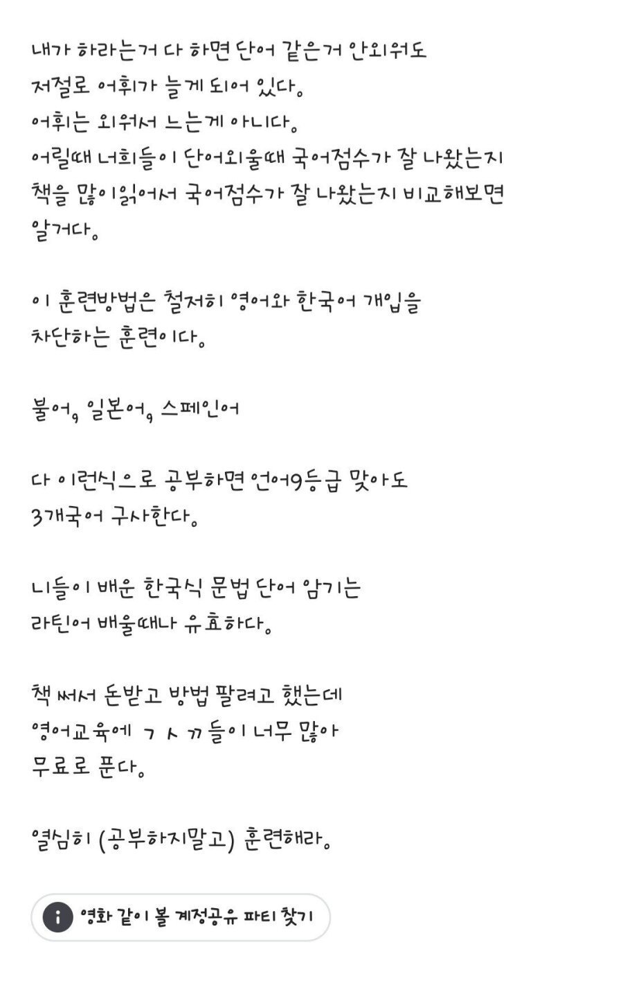 ¾Æ¸¶ ÀúÀÚÀÇ Àǵµ´Â ¿µ¾î¸¦ ³×ÀÌÆ¼ºê·Î ¹Þ¾ÆµéÀÌ´Â °ÍÀ» ¸»ÇÏ·Á´Â °Í °°Àºµ¥ ÀÌ°Ô »ç½Ç °¡Àå È¿°úÀûÀ̱ä ÇÔ. ¹®Á¦´Â È¿À²ÀûÀÌÁø ¾ÊÀ½. ´Ù¸¸ ¾Æ¿¹ ¿µ¾î¿¡ ¹®¿ÜÇÑÀÌ ¾Æ´Ï¶ó ¾Ö¸ÅÇÑ ÁöÁ¡¿¡ ÀÖ´Â ´ë´Ù¼ö Çѱ¹Àο¡°Ô´Â °¡Àå ¹®Á¦°¡ ¿µ¾î¸¦ ÀÚ²Ù Çѱ¹¾î·Î ÇØ¼®ÇÏ·Á ÇѴٴ°Ŷó¼­, ȸȭ¿¡¸¸ ±íÀÌ °ü½ÉÀ» °¡Áø´Ù¸é ±ÛÀÇ ¹æ¹ýµµ ³ª»ÚÁø ¾Ê´Ù º½