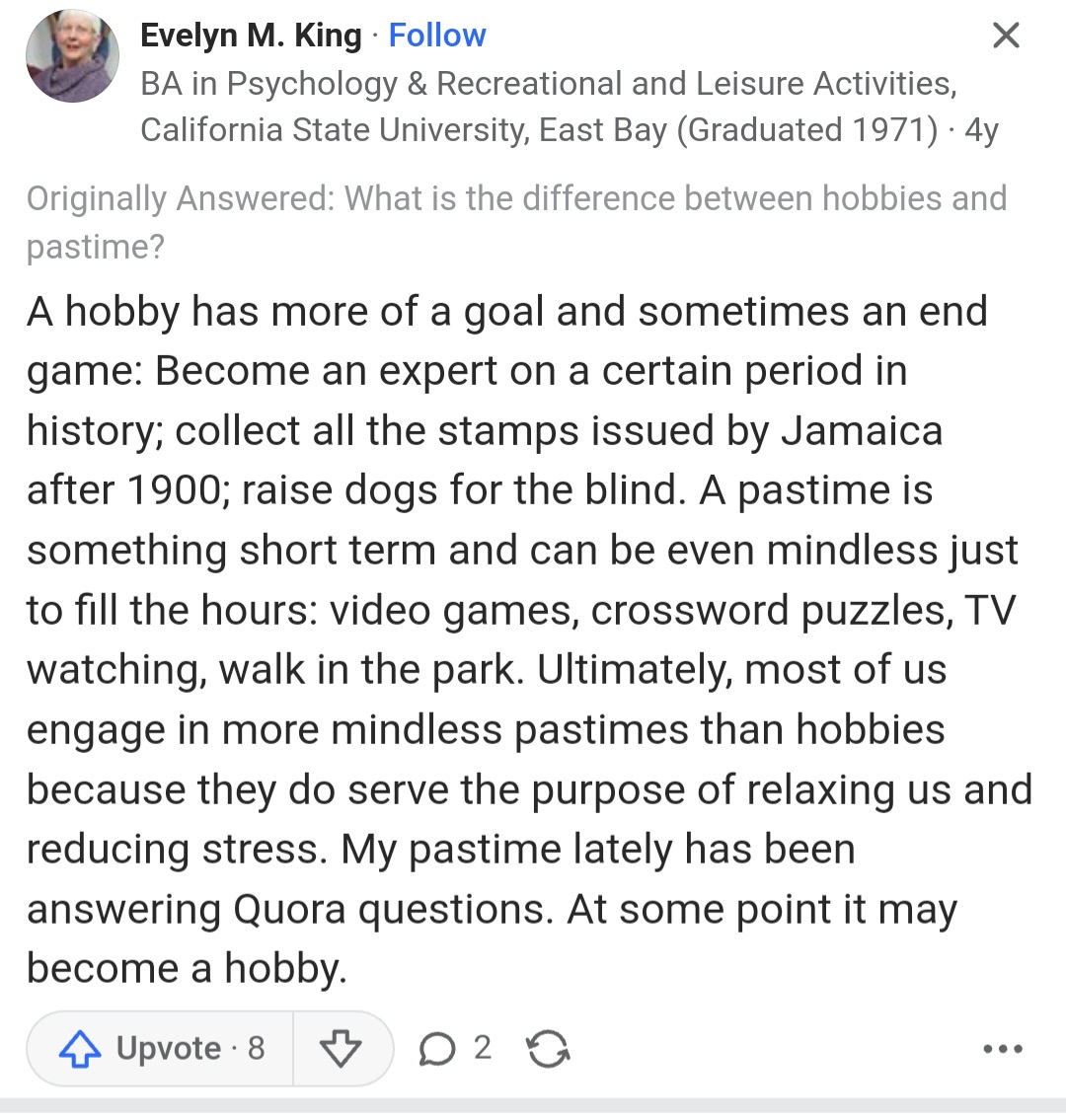 Hobby º¸´Ù´Â pastime À» ¾²±âµµ Çϴµ¥ hobby´Â ¹º°¡ ±æ°í Á¾Á¡À» Âï´Â µíÇÑ ´À³¦ÀÇ Ãë¹Ì ¶ó°í Çϸé pastimeÀº ±×³É ½Ã°£ º¸³»±â À§ÇØ Àç¹Ì·Î ÇÏ´Â °ÍÀ» ÀÇ¹Ì ÇÏ´Ï±î º¸Åë ¿ì¸®°¡ ¹¯´Â ¿ëµµ·Î´Â pastime ÀÌ ´õ ¸ÂÁö