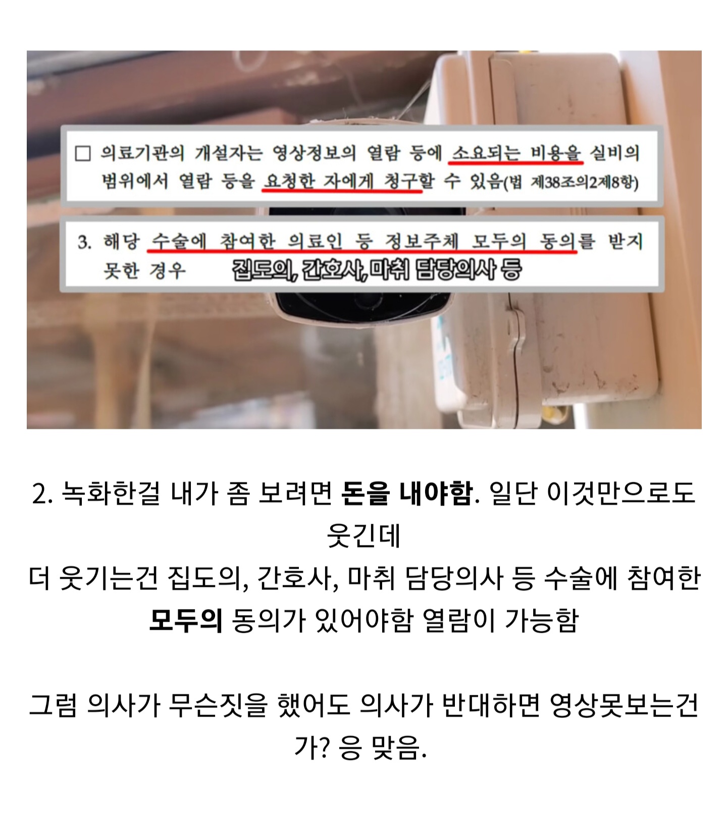 ±×°Ç ¸»ÇØÁØ °Å °°Àºµ¥. CCTV ¿µ»ó È®ÀÎÇÏ°í º¹»ç¶ß°í Àü´ÞÇϰí ÇÏ´Â °Ô 5ºÐ 10ºÐ °É¸®´Â Àϵµ ¾Æ´Ï°í ³ìÈ ¿µ»ó û±¸°¡ 1ȸ¸¸ °¡´ÉÇÏ´Ù´Â Á¶Ç×ÀÌ ÀÖ´Â °Íµµ ¾Æ´Ô. ¿µ»ó ÀÒ¾î¹ö·È´Ù, ÈÁúÀÌ ±úÁ®¼ ¿Ô´Ù, ´õ ¾ÕºÎºÐµµ ÇÊ¿äÇÏ´Ù µîµî ¿µ»ó û±¸ ±Ç¸®¸¦ ¾î¶² ºô¹Ì·Îµç ¾Ç¿ëÇÒ ¿©Áö°¡ ÀÖÁö. ±Ùµ¥ º´¿ø¿¡¼´Â ±×³É ÇØÁà¾ßµÊ. ¿Ö? ¹ýÀÌ Àǹ«·Î Á¤ÇسùÀ¸´Ï±î. ³ª´Â CCTV¼³Ä¡¸¦ ¹Ý´ëÇÏ´Â °Ô ¾Æ´Ô. ºñ¿ëû±¸ Á¶Ç×À» ÀÌÇØÇÏ´Â ¸øÇÏ´Â »ç¶÷µéÀÌ ÀÖ¾î¼ Àú Á¶Ç×ÀÇ Á¤´ç¼ºÀ» ¾ê±âÇÏ´Â °ÅÁö