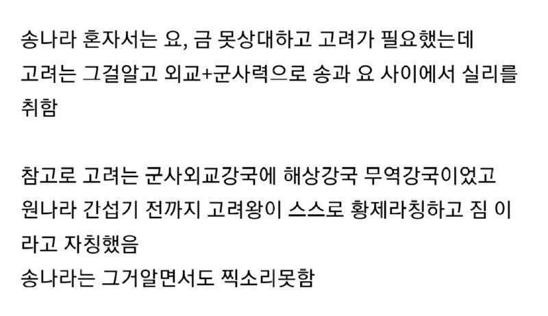 Àú Ç׸ñ ÇϳªÇϳª ÆÑƮüũ´Â ¸øÇϰÚÁö¸¸ °í·Á¿Í ¼ÛÀÇ °ü°è°¡ ¾à¼Ò±¹ÀÌ ¼³¼³±â´Â »ç´ë¿Ü±³¿Í´Â Á» ´Þ¶ú´ø°Ç »ç½Ç°°À½. °í·ÁÀÇ »ç´ë´Â »ç´ëÀÚü°¡ ¸ñÀûÀÌ µÇ´Â À̵¥¿Ã·Î±â°¡ ±»¾îÁö±â ÀüÀ̶ó ¸íºÐº¸´Ù´Â °´ë±¹ÀÇ ±¹·ÂÀÌ ´õ Áß¿äÇß°í, ¼ÛÀº °´ë±¹ÀÌÁö¸¸ ´Ù¸¥½Ã´ëÀÇ Áß±¹ÅëÀÏÁ¦±¹µéº¸´Ù´Â ±¹·ÂÀÌ ¹Ì¹¦Çؼ...