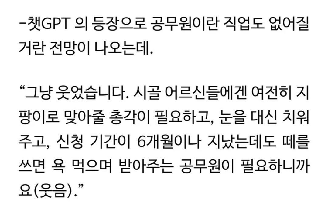Àú°Ô ÀÌÀ¯¶ó¸é Ai·Î ´ëüµÈ °ø¹«¿øÀÇ ¹Ì·¡´Â ´õ ¾Ï¿ïÇѵ¥... »ç¶÷ÀÌ ÇÒÀÏÀº ÇÏ·çÁ¾ÀÏ Áø»ó ´ëÀÀÀÌÀݾÆ