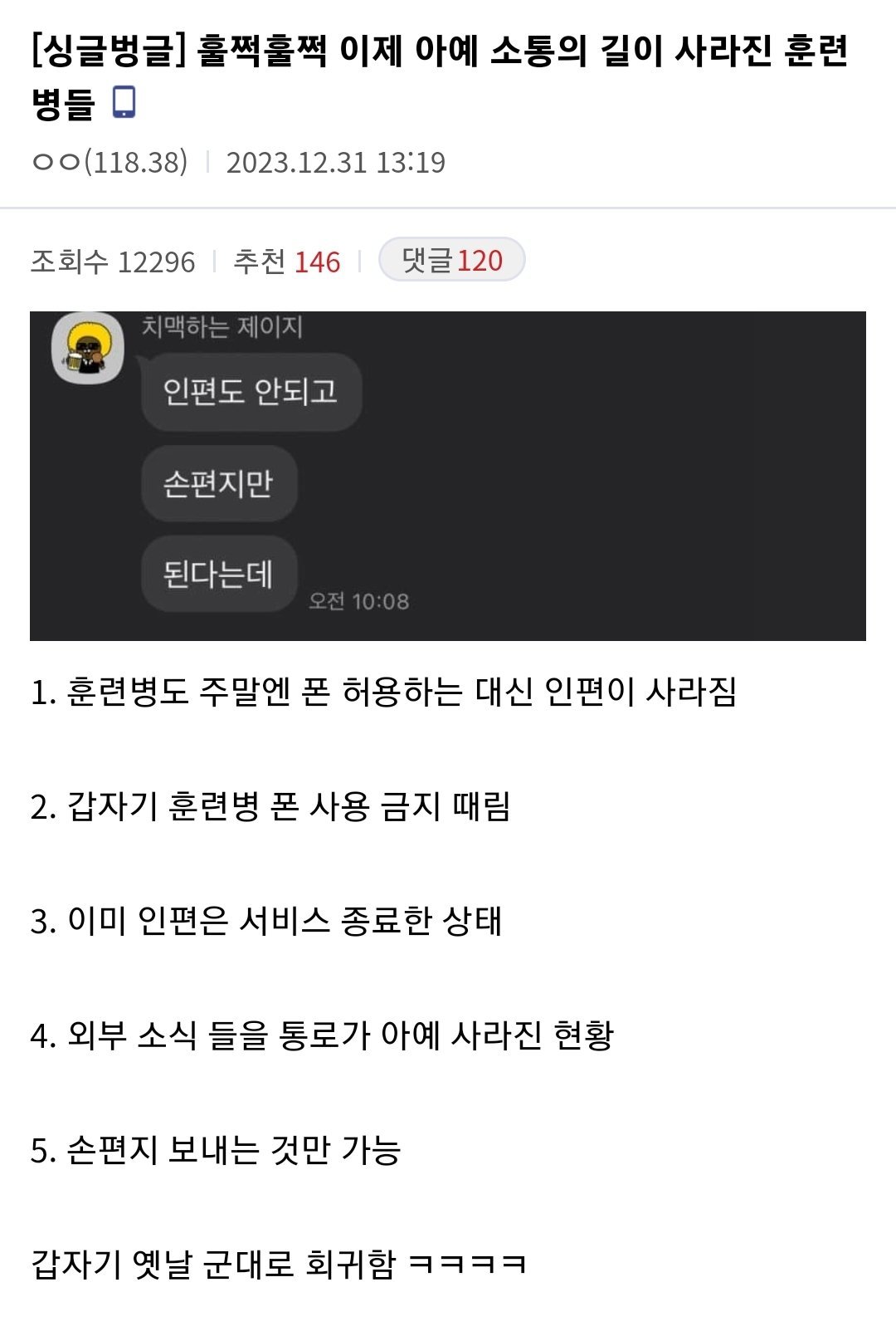 1ÁÖÂ÷´Â ºñµÑ±â Áö±Þ ¹Þ¾Ò°í ¼Ò´ëÀå ÈÆ·Ãº´¸¸ ¸Å »ç¿ëÇßÀ½. 4ÁÖÂ÷ ³Ñ¾î°¡¸é ÈÆ·Ã Àß¹Þ´Â ºÐ´ë ¾Þ¹«»õ »ç¿ëÇÔ