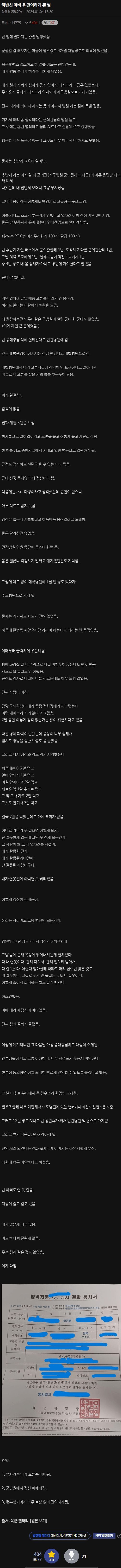 ¤»¤»¤» ³ªµµ ±º´ë°¡±âÀü¿£ Ç㸮¾ÆÇÃÀÏ ¾ø¾î¼ ¸ô¶ú´Âµ¥ °è¼Ó ±Ù¹« 1½Ã°£30ºÐ~2½Ã°£ ¼´Ùº¸¸é ¼ÀÖ´Â ÇÑÀÚ¼¼·Î ¿À·¡ÀÖ´Ùº¸¸é Ç㸮 ¾ÆÆÄ¼ ±¹±º¼öµµ ¾çÁÖº´¿ø°¬´õ´Ï ôÃßÃø¸¸Áõ Áø´Ü¹ÞÀ½...... ±Ùµ¥µµ ±Ù¹«´Â ´Ù ¼¶..... ºÎ´ë´Â º¸¸é ÀüºÎ´Ù ȯÀÚ ÃµÁöÀÓ, ¼±Àӵ鵵 °íÀÛ ±×·±°É·Î ±Ù¹«ºüÁö¸¸ ´Ù¸¥»ç¶÷µé ÇÇÇØº¸´Â°Ç ¾î¶»°Ô °¨´çÇÒ²¨³Ä.... ±×·¡¼ ³ªµµ ±×°Ç ¸Â´Â¼Ò¸°°Å °°¾Æ¼ ºÒ¸¸¾øÀÌ ±Ù¹«¼¶....... ±Ùµ¥ ±×·¯°í Àü¿ªÇÏ°íµµ ÇÑÂüÁö³ª¼ ±³Åë»ç°í ³ÀûÀִµ¥ CTÀÎÁö ¿¢½º·¹ÀÎÁö ¸ð¸£°Ú´Âµ¥ º´¿ø°¬´õ´Ï ¼±Ãµ¼º ôÃߺи®Áõ Áø´Ü¹ÞÀ½, ¾ÖÃÊ¿¡ ³ ž¶§ºÎÅÍ 6¹øÃ´Ãß»À°¡ ¾øÀ½...... Áö±Ý±îÁö ¾È¾ÆÇÁ°íÀÖ¾ú´ø°Ç ±×³ª¸¶ ±ÙÀ°ÀÌ À¯Áö°¡ µÇ¼ ¹öƼ°í ÀÖ¾ú´ø°Å°í ¹«Á¶°Ç ³ªÀ̵é¾î¼ ±ÙÀ° ¾àÇØÁö¸é 100%¼ö¼úÇØ¾ßµÇ´Â °Å¶ó°íÇÔ, ±×·¡¼ ³»°¡ ÀÌ°Ô Ãø¸¸ÁõÀ̶û ÇÞ°¥¸±¼ö°¡ Àִ°ǰ¡¿ä ¶ó°í ¹°¾îºÃ´Âµ¥, ¿Ö ±×·¯³Ä°í ¹¯±æ·¡ ±º´ëÀÖÀ»¶§ ¼öµµº´¿ø¿¡¼ ±×·¸°Ô Áø´Ü¹ÞÀºÀû ÀÖ´Ù°í Çß´õ´Ï...... ¿ø·¡ ±×·±»õ³¢µé ´Ù µ¹ÆÈÀÌ¶ó¼ ±×·±´Ù°í ÇÏ´õ¶ó.... ÀÏ´ÜÀº Áø´Ü³»¸®°í ¹¹Çϸé ÁöµéÀÌ Ã¥ÀÓÀ» Á®¾ßµÇ¼ Ã¥ÀÓȸÇǼºÀ¸·Î Áø´Ü ³»¸°´Ù´õ¶ó........